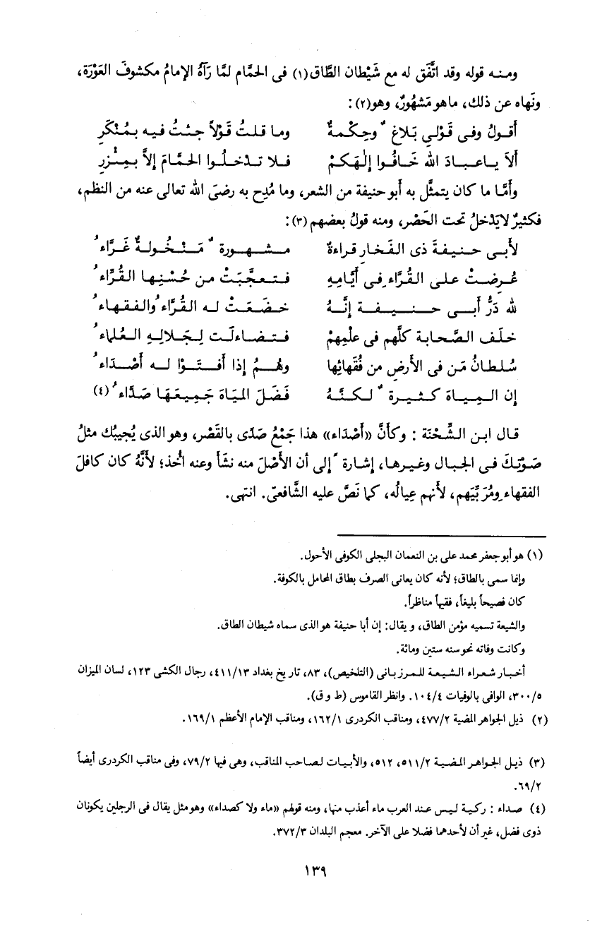 139 و منه قوله و قد اتّفق له مع شيطان الطّاق 1 فى الحمّام لمّا رآه الإمام مكشوف العورة، و نهاه عن ذلك، ما هو مشهور، و هو 2: