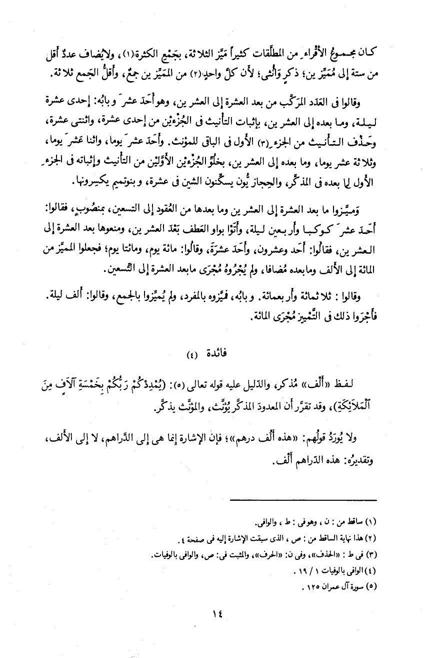 و الدّليل عليه قوله تعالى 5: (يُمْدِدْكُمْ رَبُّكُمْ بِخَمْسَةِ آلاافٍ مِنَ اَلْمَلاائِكَةِ)، و قد تقرّر أن المعدود المذكّر يؤنّث، و المؤنّث يذكّر.