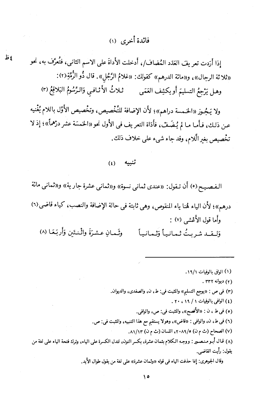 الفصيح 5 أن تقول: «عندى ثمانى نسوة» و «ثمانى عشرة جارية» و «ثمانى مائة درهم»؛ لأن الياء هنا ياء المنقوص، و هى ثابتة فى حالة الإضافة و النصب، كياء قاضى 6 و أما قول الأعشى 7: