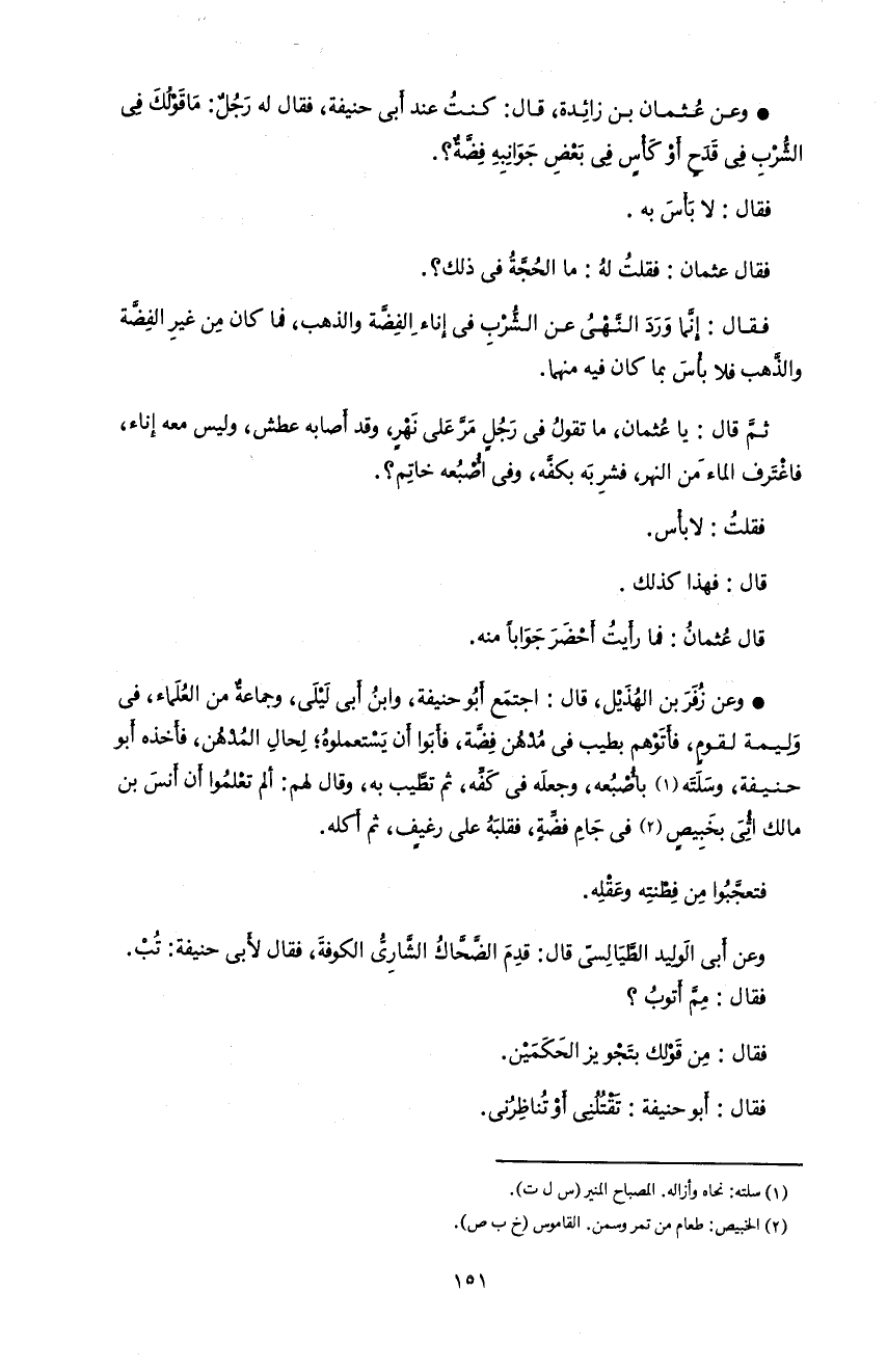151 *و عن عثمان بن زائدة، قال: كنت عند أبى حنيفة، فقال له رجل: ما قولك فى الشّرب فى قدح أو كأس فى بعض جوانبه فضّة؟.