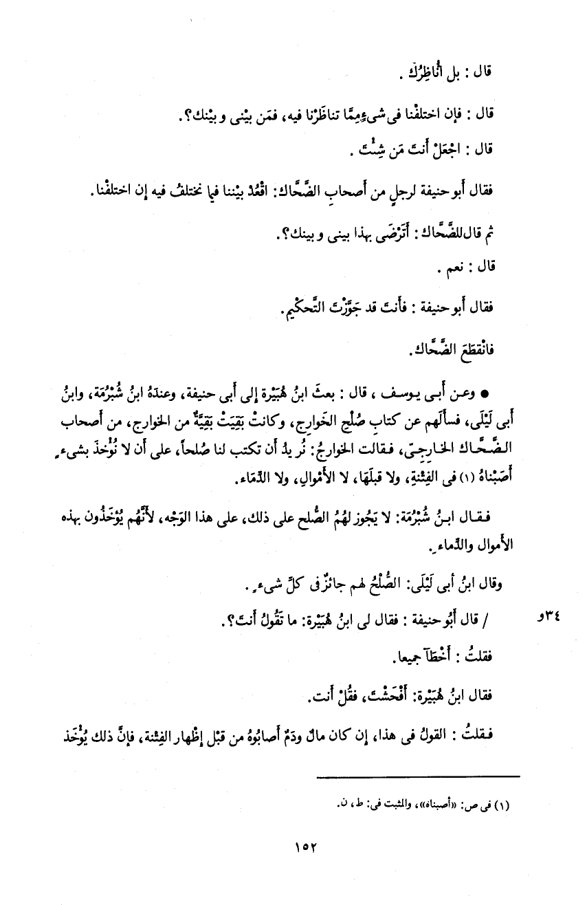 *و عن أبى يوسف، قال: بعث ابن هبيرة إلى أبى حنيفة، و عنده ابن شبرمة، و ابن أبى ليلى، فسألهم عن كتاب صلح الخوارج، و كانت بقيت بقيّة من الخوارج، من أصحاب الضّحّاك الخارجىّ، فقالت الخوارج: نريد أن تكتب لنا صلحا، على أن لا نؤخذ بشاء أصبناه 1 فى الفتنة، و لا قبلها، لا الأموال، و لا الدّماء.