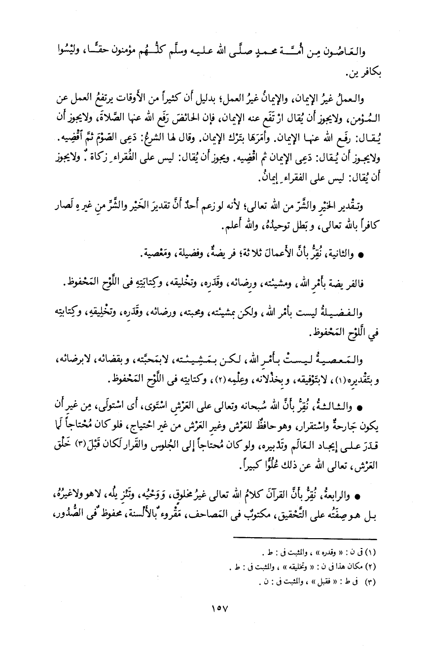 157 و العاصون من أمّة محمد صلّى اللّه عليه و سلّم كلّهم مؤمنون حقّا، و ليسوا بكافرين.