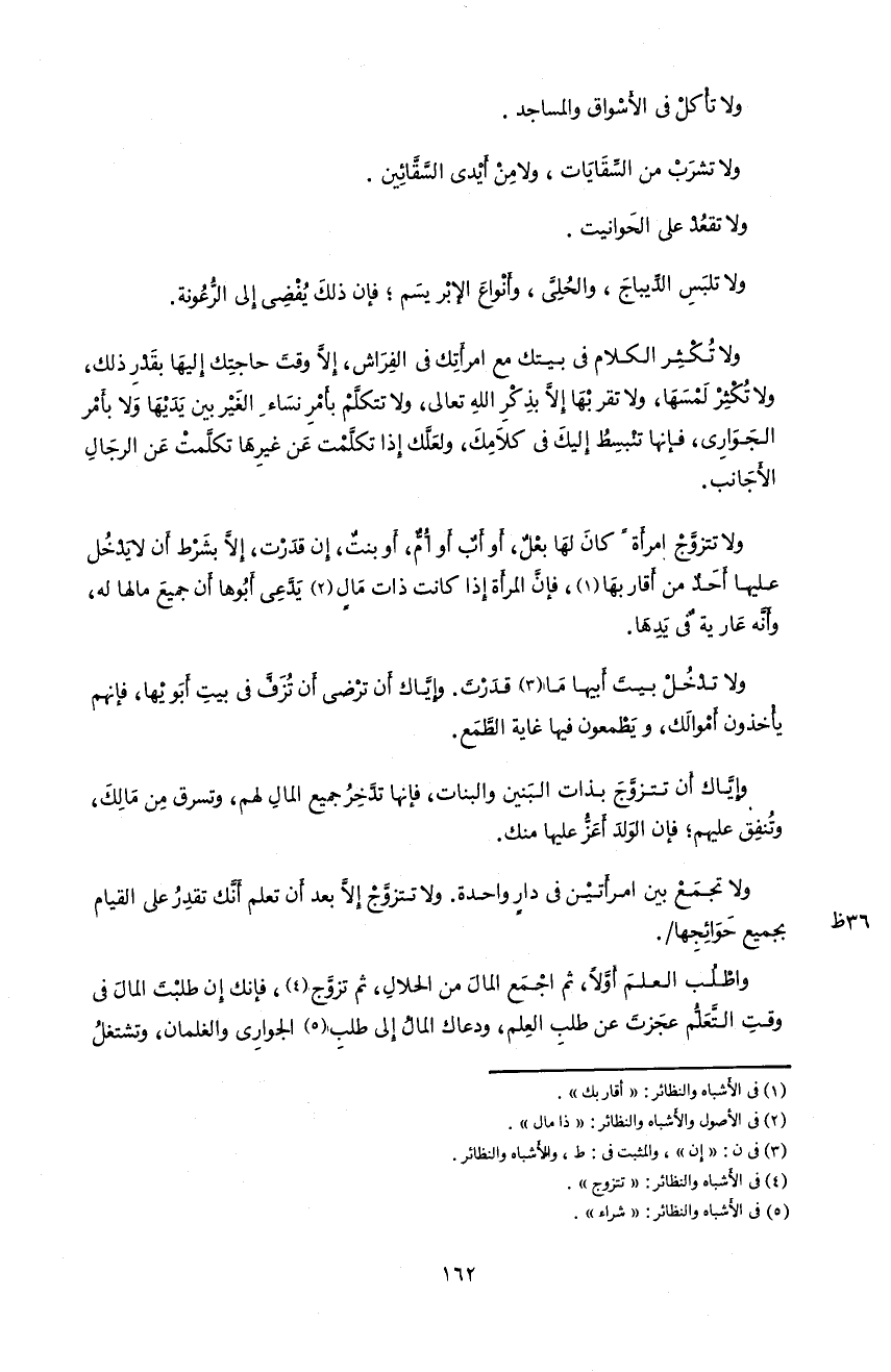 و لا تجمع بين امرأتين فى دار واحدة. و لا تتزوّج إلاّ بعد أن تعلم أنّك تقدر على القيام بجميع حوائجها/.