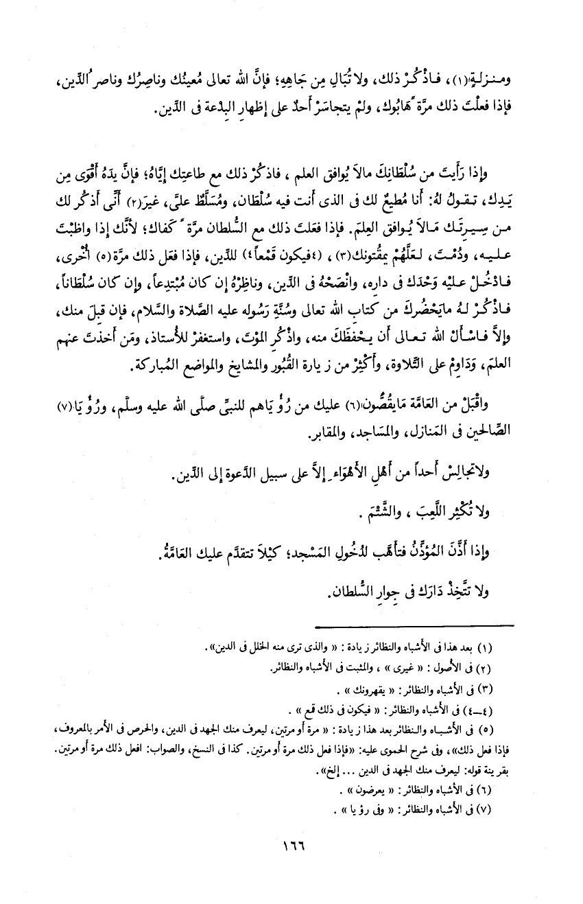 و إذا رأيت من سلطانك مالا يوافق العلم، فاذكر ذلك مع طاعتك إيّاه؛ فإنّ يده أقوى من يدك، تقول له: أنا مطيع لك فى الذى أنت فيه سلطان، و مسلّط علىّ، غير 2 أنّى أذكر لك من سيرتك مالا يوافق العلم. فإذا فعلت ذلك مع السّلطان مرّة كفاك؛ لأنّك إذا واظبت عليه، و دمت، لعلّهم يمقتونك 3، 4 فيكون قمعا 4 للدّين، فإذا فعل ذلك مرّة 5 أخرى، فادخل عليه وحدك فى داره، و انصحه فى الدّين، و ناظره إن كان مبتدعا، و إن كان سلطانا، فاذكر له ما يحضرك من كتاب اللّه تعالى و سنّة رسوله عليه الصّلاة و السّلام، فإن قبل منك، و إلاّ فاسأل اللّه تعالى أن يحفظك منه، و اذكر الموت، و استغفر للأستاذ، و من أخذت عنهم العلم، و داوم على التّلاوة، و أكثر من زيارة القبور و المشايخ و المواضع المباركة.