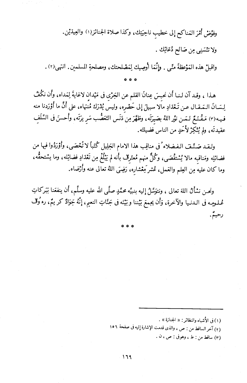 *** هذا، و قد آن لنا أن نحبس عنان القلم عن الجرى فى ميدان لا غاية لمداه، و أن نكفّ لسان المقال عن تعداد ما لا سبيل إلى حصره، و ليس يدرك منتهاه، على أنّ ما أوردنا منه فيه 3 مقنع لمن نوّر الله بصيرته، و طهّر من دنس التعصّب سريرته، و أحسن فى السّلف عقيدته، و لم ينكر لأحد من الناس فضيلته.