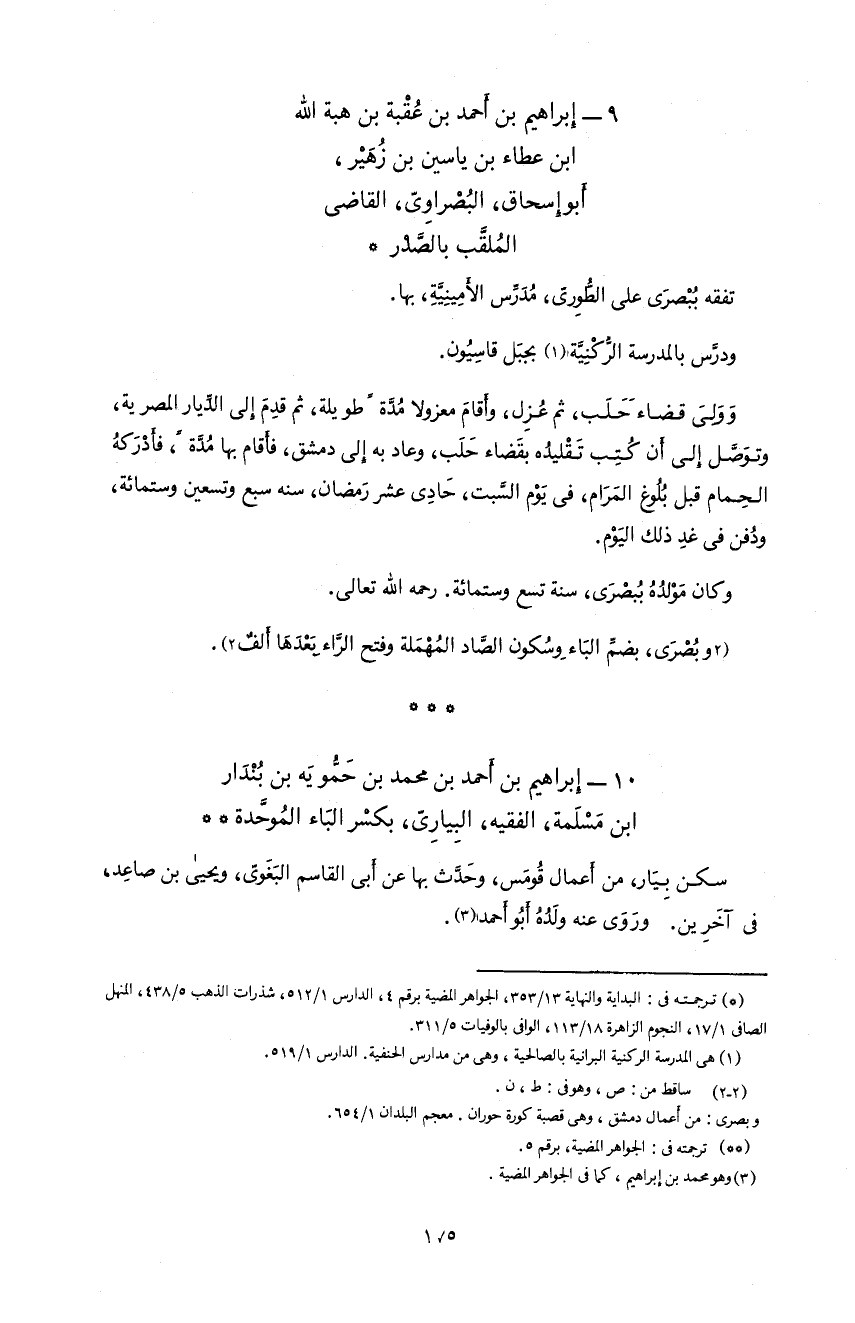 9 - إبراهيم بن أحمد بن عقبة بن هبة اللّه ابن عطاء بن ياسين بن زهير، أبو إسحاق، البصراوىّ، القاضى الملقّب بالصّدر *