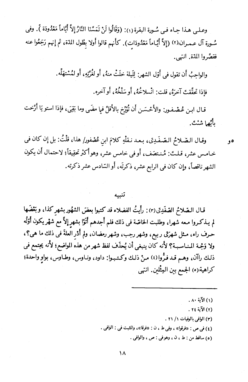 18 و على هذا جاء فى سورة البقرة 1: (وَ قاالُوا لَنْ تَمَسَّنَا اَلنّاارُ إِلاّا أَيّااماً مَعْدُودَةً). و فى سورة آل عمران 2 (إِلاّا أَيّااماً مَعْدُودااتٍ). كأنهم قالوا أولا بطول المدّة، ثم إنهم رجعوا عنه فقصّروا المدّة. انتهى.
