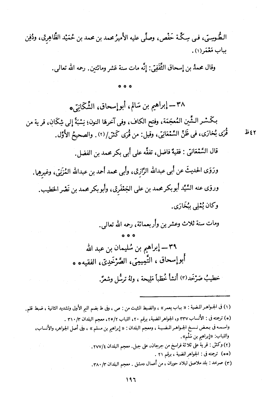 *) ترجمته فى: الأنساب 337 و، الجواهر المضية، برقم 20، اللباب 2/ 25، معجم البلدان 3/ 310. و اسمه فى بعض نسخ الجواهر المضية، و معجم البلدان: «إبراهيم بن مسلم»، و فى أصل الجواهر، و الأنساب، و اللباب: «إبراهيم بن سلم».