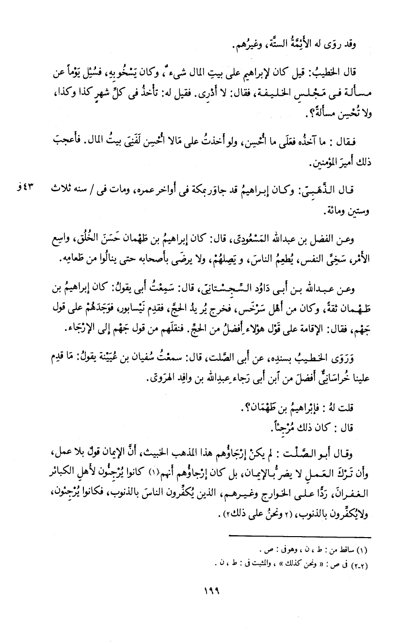 و عن عبد اللّه بن أبى داود السّجستانىّ، قال: سمعت أبى يقول: كان إبراهيم بن طهمان ثقة، و كان من أهل سرخس، فخرج يريد الحجّ، فقدم نيسابور، فوجدهم على قول جهم، فقال: الإقامة على قول هؤلاء أفضل من الحجّ. فنقلهم من قول جهم إلى الإرجاء.
