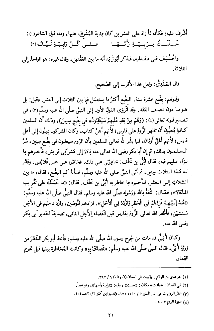 و قولهم: بضع عشرة سنة. البضع أكثر ما يستعمل فيما بين الثلاث إلى العشر. و قيل: بل هو ما دون نصف العقد. و قد انزوى القول الأول إلى النبىّ صلّى اللّه عليه و سلّم 3، فى تفسير قوله تعالى 4: (وَ هُمْ مِنْ بَعْدِ غَلَبِهِمْ سَيَغْلِبُونَ* فِي بِضْعِ سِنِينَ)، و ذلك أن المسلمين كانوا يحبّون أن تظهر الرّوم على فارس؛ لأنهم أهل كتاب، و كان المشركون يميلون إلى أهل فارس؛ لأنهم أهل أوثان، فلما بشّر اللّه تعالى المسلمين بأن الرّوم سيغلبون فى بضع سنين، سرّ المسلمون بذلك، ثم إن أبا بكر رضى اللّه تعالى عنه بادر إلى مشركى قريش، فأخبرهم بما نزل عليهم فيه، فقال ابىّ بن خلف: خاطرنى على ذلك. فخاطره على خمس قلائص، و قدّر له مدّة الثلاث سنين، ثم أتى النبىّ صلى اللّه عليه و سلّم، فسأله كم البضع، فقال، ما بين الثلاث إلى العشر. فأخبره بما خاطر به أبىّ بن خلف. فقال: «ما حملك على تقريب المدّة؟»، فقال: الثّقة باللّه و رسوله صلّى اللّه عليه و سلم. فقال النبىّ صلّى اللّه عليه و سلّم: