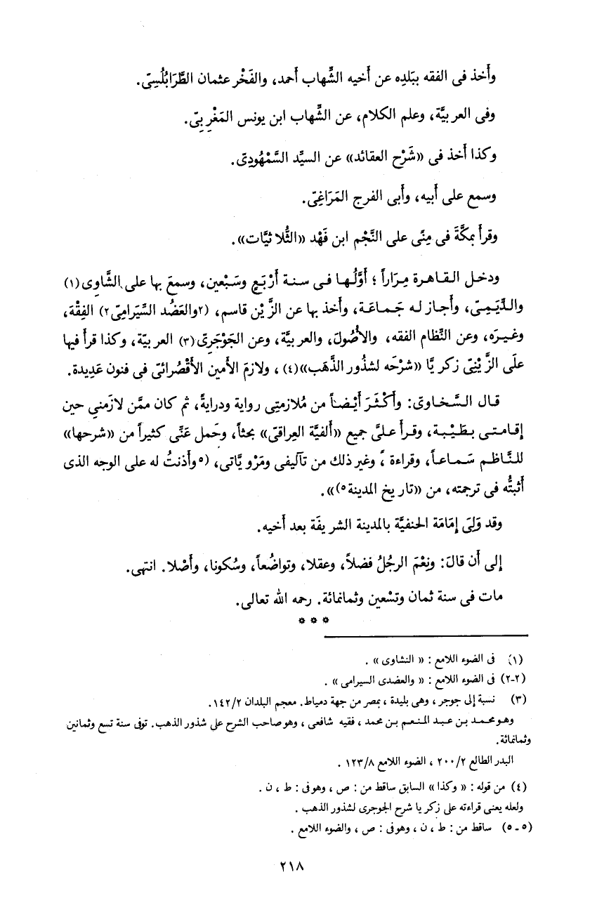 218 و أخذ فى الفقه ببلده عن أخيه الشّهاب أحمد، و الفخر عثمان الطّرابلسىّ.