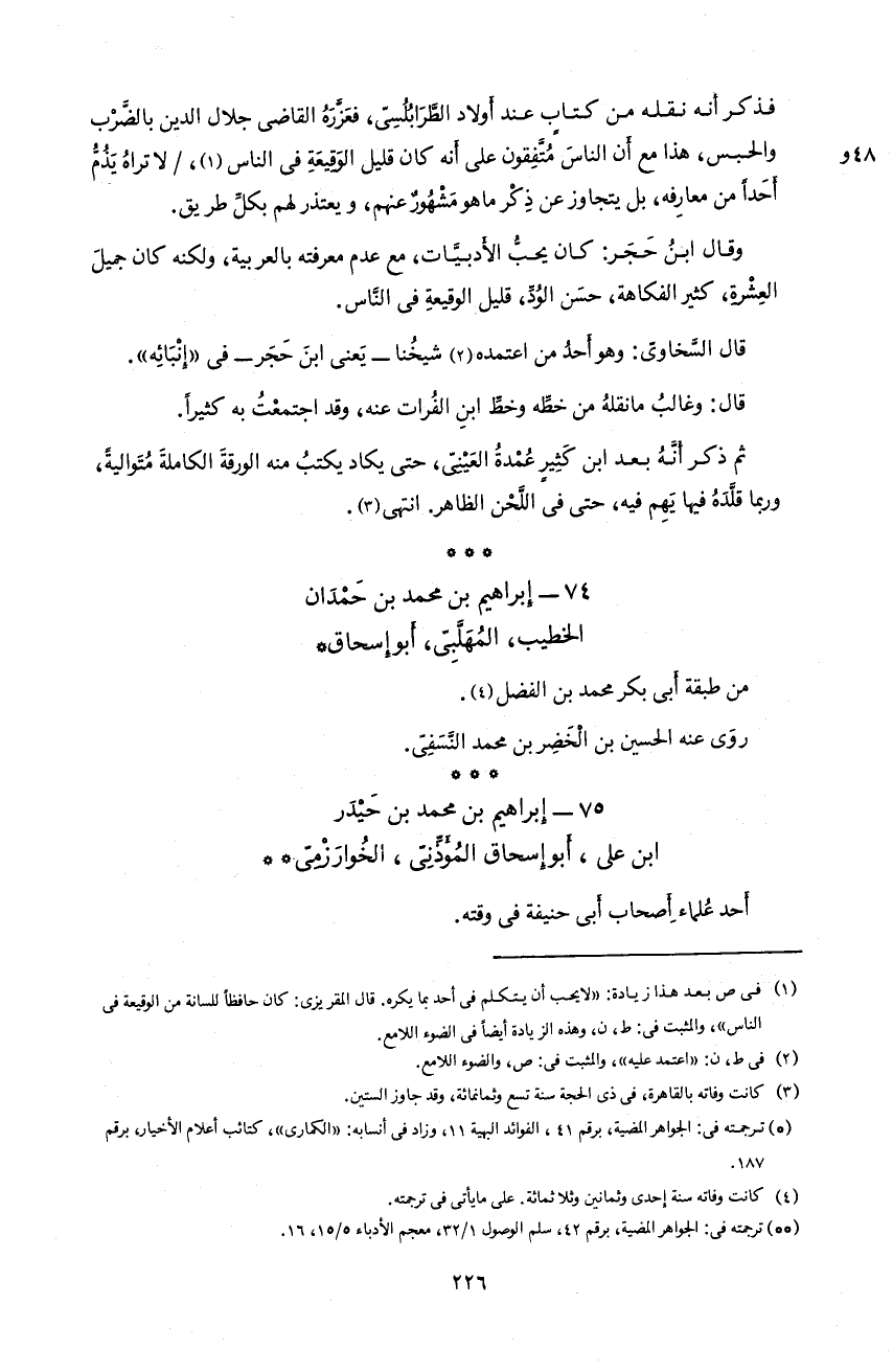 226 فذكر أنه نقله من كتاب عند أولاد الطّرابلسىّ، فعزّره القاضى جلال الدين بالضّرب و الحبس، هذا مع أن الناس متّفقون على أنه كان قليل الوقيعة فى الناس 1، /لا تراه يذمّ أحدا من معارفه، بل يتجاوز عن ذكر ما هو مشهور عنهم، و يعتذر لهم بكلّ طريق.