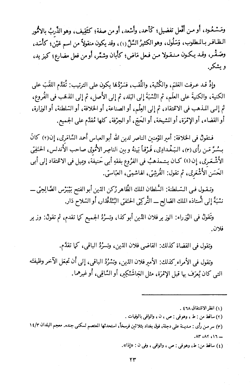 فتقول فى الخلافة: أمير المؤمنين الناصر لدين اللّه أبو العباس أحمد السّامرىّ، إن 2 كان بسرّ من رأى 3، البغدادىّ، فرقا بينه و بين الناصر الأموىّ صاحب الأندلس، الحنفىّ الأشعرىّ، إن 4 كان يتمذهب فى الفروع بفقه أبى حنيفة، و يميل فى الاعتقاد إلى أبى الحسن الأشعرىّ، ثم تقول: القرشىّ، الهاشمىّ، العبّاسىّ.