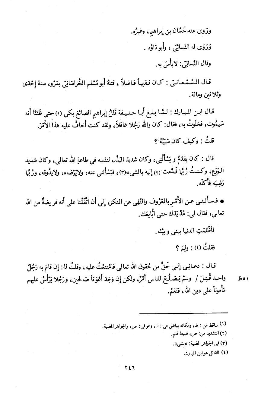 قال: دعانى إلى حقّ من حقوق اللّه تعالى فامتنعت عليه، و قلت له: إن قام به رجل واحد قتل/و لم يصلح للناس أمر، و لكن إن وجد أعوانا صالحين، و رجلا يرأس عليهم مأمونا على دين اللّه، فنعم.