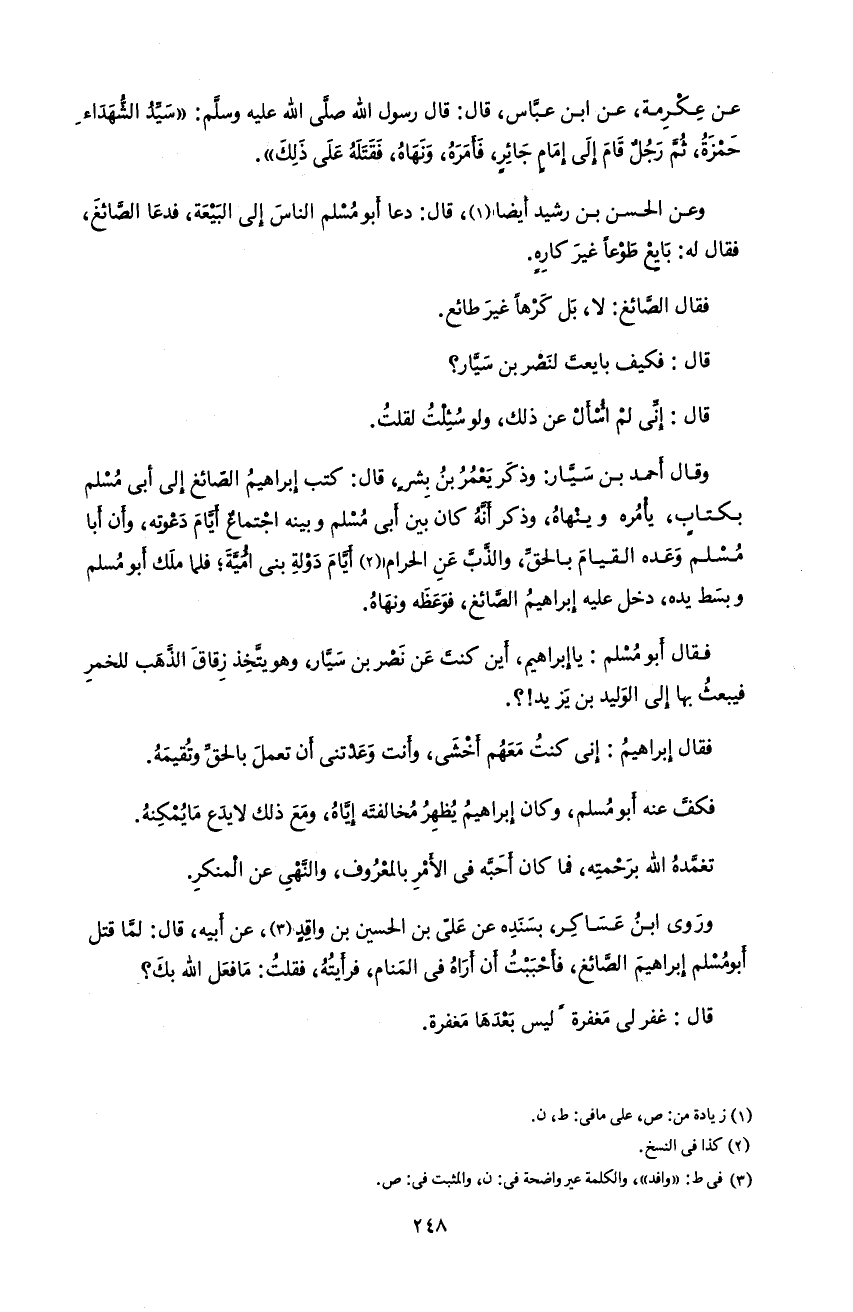 248 عن عكرمة، عن ابن عبّاس، قال: قال رسول اللّه صلّى اللّه عليه و سلّم: «سيّد الشّهداء حمزة، ثمّ رجل قام إلى إمام جائر، فأمره، و نهاه، فقتله على ذلك».