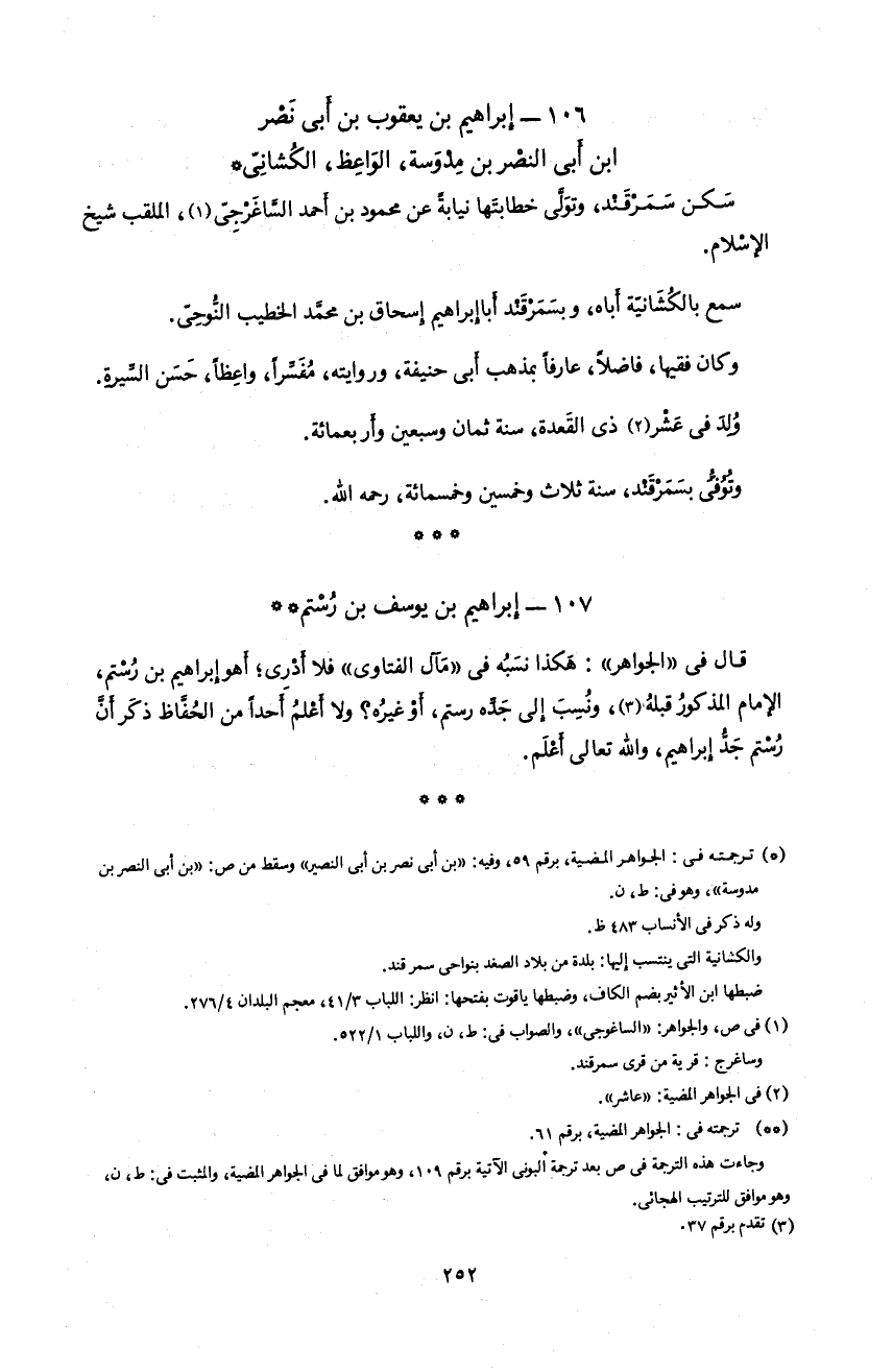 *) ترجمته فى: الجواهر المضية، برقم 59، و فيه: «بن أبى نصر بن أبى النصير» و سقط من ص: «بن أبى النصر بن مدوسة»، و هو فى: ط، ن. و له ذكر فى الأنساب 483 ظ. و الكشانية التى ينتسب إليها: بلدة من بلاد الصغد بنواحى سمرقند. ضبطها ابن الأثير بضم الكاف، و ضبطها ياقوت بفتحها: انظر: اللباب 3/ 41، معجم البلدان 4/ 276.