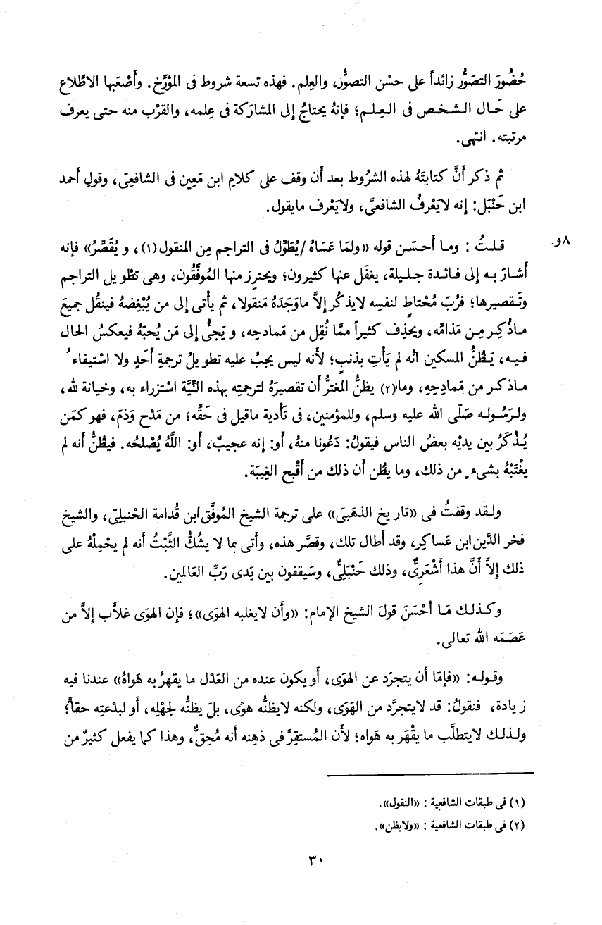 قلت: و ما أحسن قوله «و لما عساه/يطوّل فى التراجم من المنقول 1، و يقصّر» فإنه أشار به إلى فائدة جليلة، يغفل عنها كثيرون؛ و يحترز منها الموفّقون، و هى تطويل التراجم و تقصيرها؛ فربّ محتاط لنفسه لا يذكر إلاّ ما وجده منقولا، ثم يأتى إلى من يبغضه فينقل جميع ما ذكر من مذامّه، و يحذف كثيرا ممّا نقل من ممادحه، و يجئ إلى من يحبّه فيعكس الحال فيه، يظنّ المسكين أنه لم يأت بذنب؛ لأنه ليس يجب عليه تطويل ترجمة أحد و لا استيفاء ما ذكر من ممادحه، و ما 2 يظنّ المغترّ أن تقصيره لترجمته بهذه النّيّة استزراء به، و خيانة للّه، و لرسوله صلّى اللّه عليه و سلم، و للمؤمنين، فى تأدية ما قيل فى حقّه؛ من مدح و ذمّ، فهو كمن يذكر بين يديه بعض الناس فيقول: دعونا منه، أو: إنه عجيب، أو: اللّه يصلحه. فيظنّ أنه لم يغتبه بشاء من ذلك، و ما يظن أن ذلك من أقبح الغيبة.