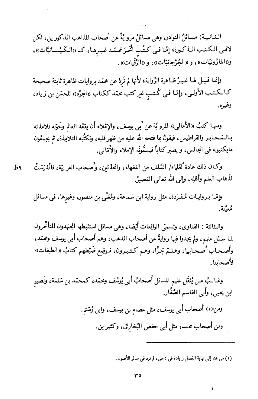 35 الثانية: مسائل النوادر، و هى مسائل مرويّة عن أصحاب المذاهب المذكورين، لكن لا فى الكتب المذكورة؛ إمّا فى كتب أخر لمحمّد غيرها، ك «الكيسانيّات»، و «الهارونيّات»، و «الجرجانيّات»، و «الرّقّيات».