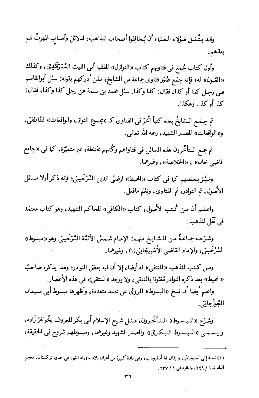 و أول كتاب جمع فى فتاويهم كتاب «النوازل» للفقيه أبى الليث السّمرقندىّ، و كذلك «العيون» له؛ فإنه جمع صور فتاوى جماعة من المشايخ، ممّن أدركهم بقوله: سئل أبو القاسم فى رجل كذا أو كذا، فقال: كذا و كذا. سئل محمد بن سلمة عن رجل كذا و كذا، فقال: