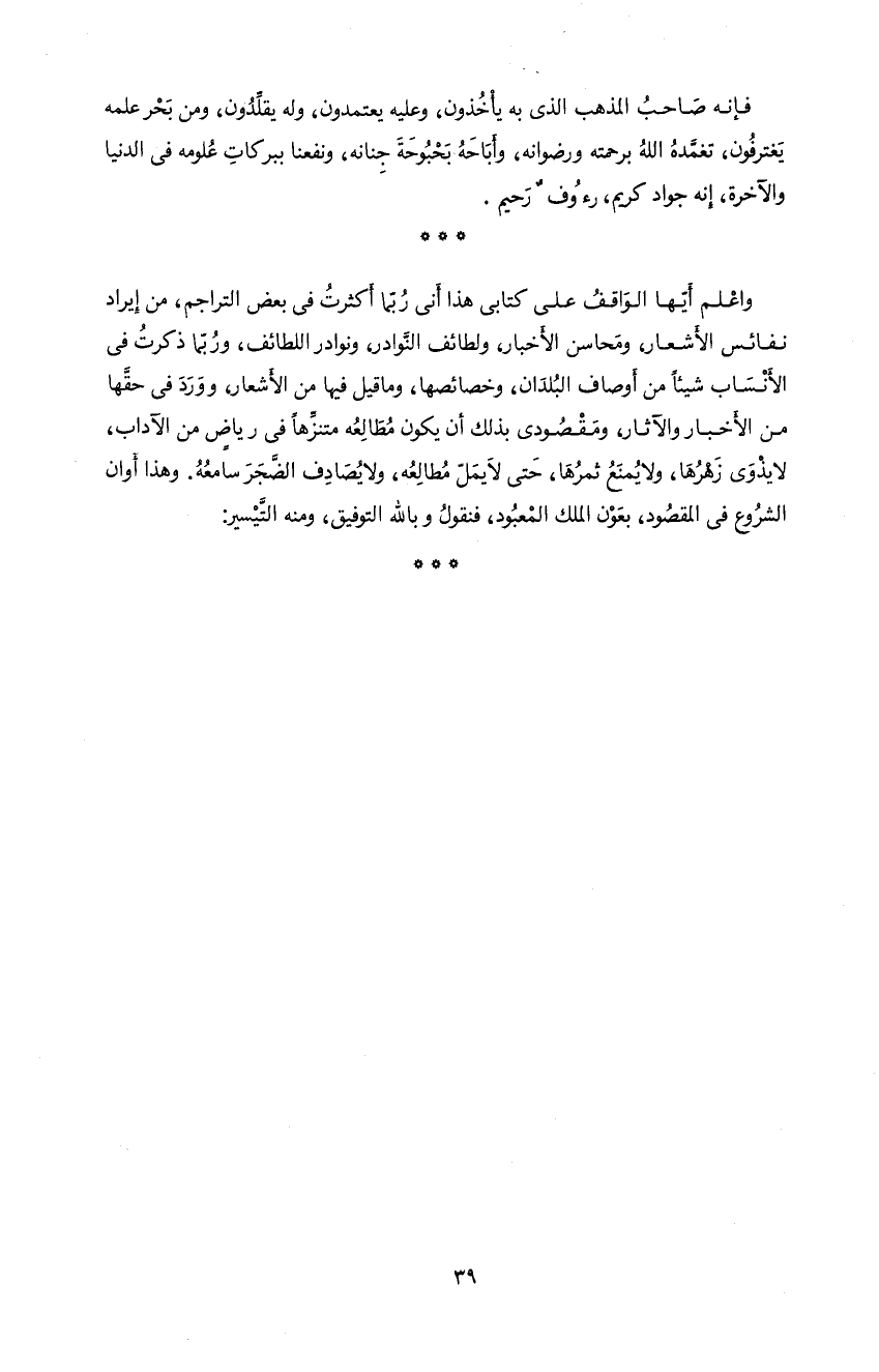 *** و اعلم أيّها الواقف على كتابى هذا أنى ربّما أكثرت فى بعض التراجم، من إيراد نفائس الأشعار، و محاسن الأخبار، و لطائف النّوادر، و نوادر اللطائف، و ربّما ذكرت فى الأنساب شيئا من أوصاف البلدان، و خصائصها، و ما قيل فيها من الأشعار، و ورد فى حقّها من الأخبار و الآثار، و مقصودى بذلك أن يكون مطالعه متنزّها فى رياض من الآداب، لا يذوى زهرها، و لا يمنع ثمرها، حتى لا يملّ مطالعه، و لا يصادف الضّجر سامعه. و هذا أوان الشروع فى المقصود، بعون الملك المعبود، فنقول و باللّه التوفيق، و منه التّيسير:
