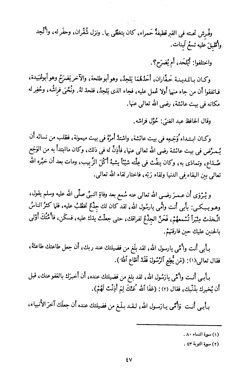 47 و فرش تحته فى القبر قطيفة حمراء، كان يتغطّى بها. و نزل شقران، و حفر له، و ألحد و أطبق عليه تسع لبنات.
