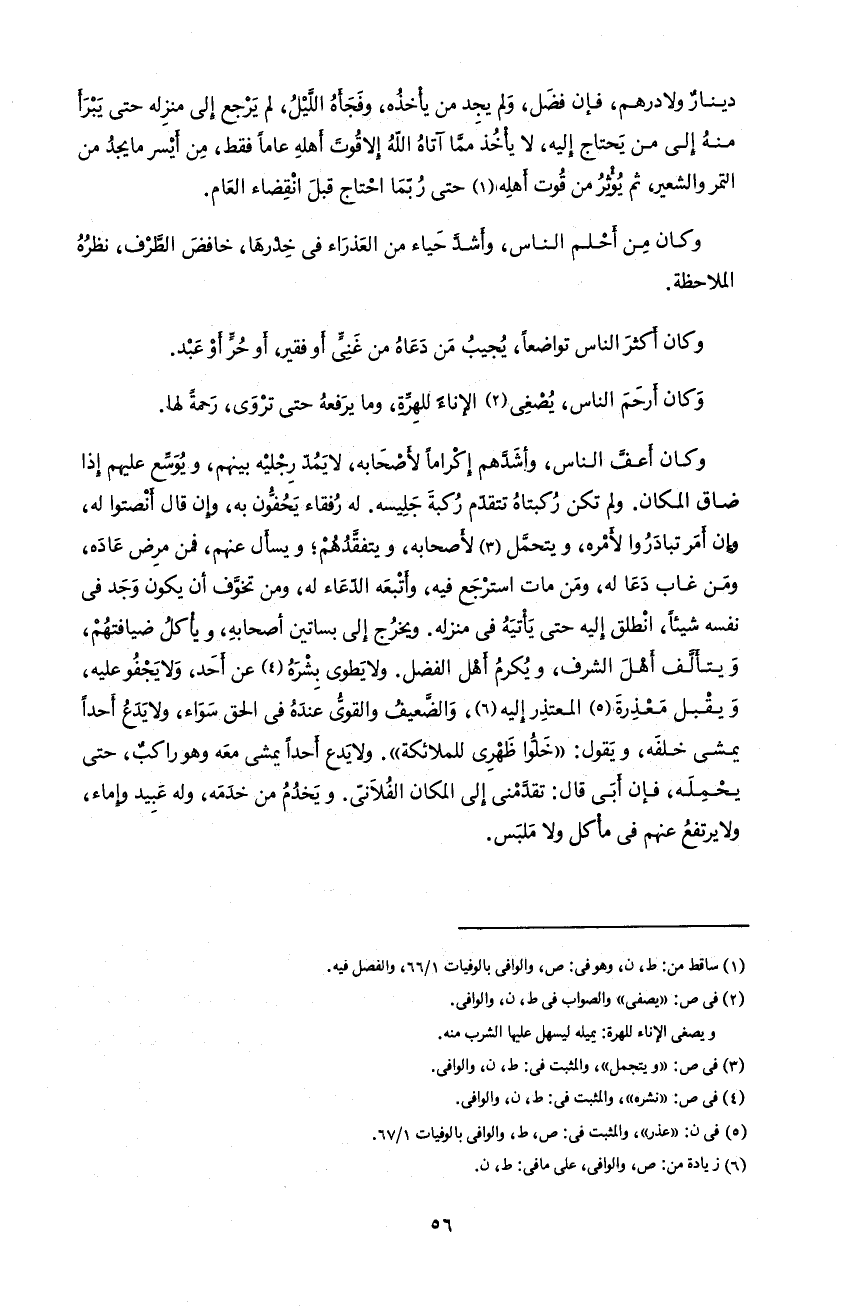 و كان أعفّ الناس، و أشدّهم إكراما لأصحابه، لا يمدّ رجليه بينهم، و يوسّع عليهم إذا ضاق المكان. و لم تكن ركبتاه تتقدّم ركبة جليسه. له رفقاء يحفّون به، و إن قال أنصتوا له، و إن أمر تبادروا لأمره، و يتحمّل 3 لأصحابه، و يتفقّدهم؛ و يسأل عنهم، فمن مرض عاده، و من غاب دعا له، و من مات استرجع فيه، و أتبعه الدّعاء له، و من تخوّف أن يكون وجد فى نفسه شيئا، انطلق إليه حتى يأتيه فى منزله. و يخرج إلى بساتين أصحابه، و يأكل ضيافتهم، و يتألّف أهل الشرف، و يكرم أهل الفضل. و لا يطوى بشره 4 عن أحد، و لا يجفو عليه، و يقبل معذرة 5 المعتذر إليه 6، و الضّعيف و القوىّ عنده فى الحق سواء، و لا يدع أحدا يمشى خلفه، و يقول: «خلّوا ظهرى للملائكة». و لا يدع أحدا يمشى معه و هو راكب، حتى يحمله، فإن أبى قال: تقدّمنى إلى المكان الفلانىّ. و يخدم من خدمه، و له عبيد و إماء، و لا يرتفع عنهم فى مأكل و لا ملبس.