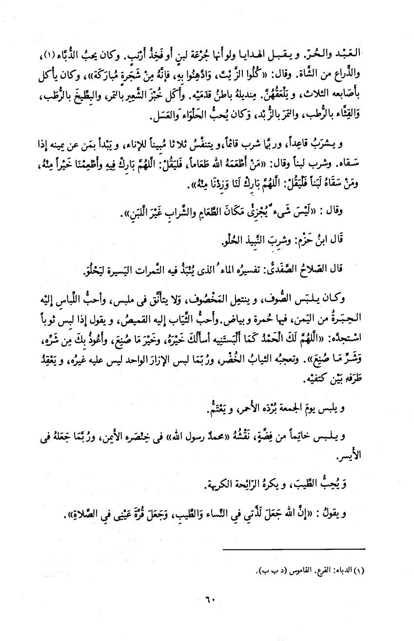 60 العبد و الحرّ. و يقبل الهدايا و لو أنها جرعة لبن أو فخذ أرنب. و كان يحب الدّبّاء 1، و الذّراع من الشّاة. و قال: «كلوا الزّيت، و ادّهنوا به، فإنّه من شجرة مباركة»، و كان يأكل بأصابعه الثلاث، و يلعقهنّ. منديله باطن قدميه. و أكل خبز الشّعير بالتمر، و البطّيخ بالرّطب، و القثّاء بالرّطب، و التمر بالزّبد، و كان يحبّ الحلواء و العسل.