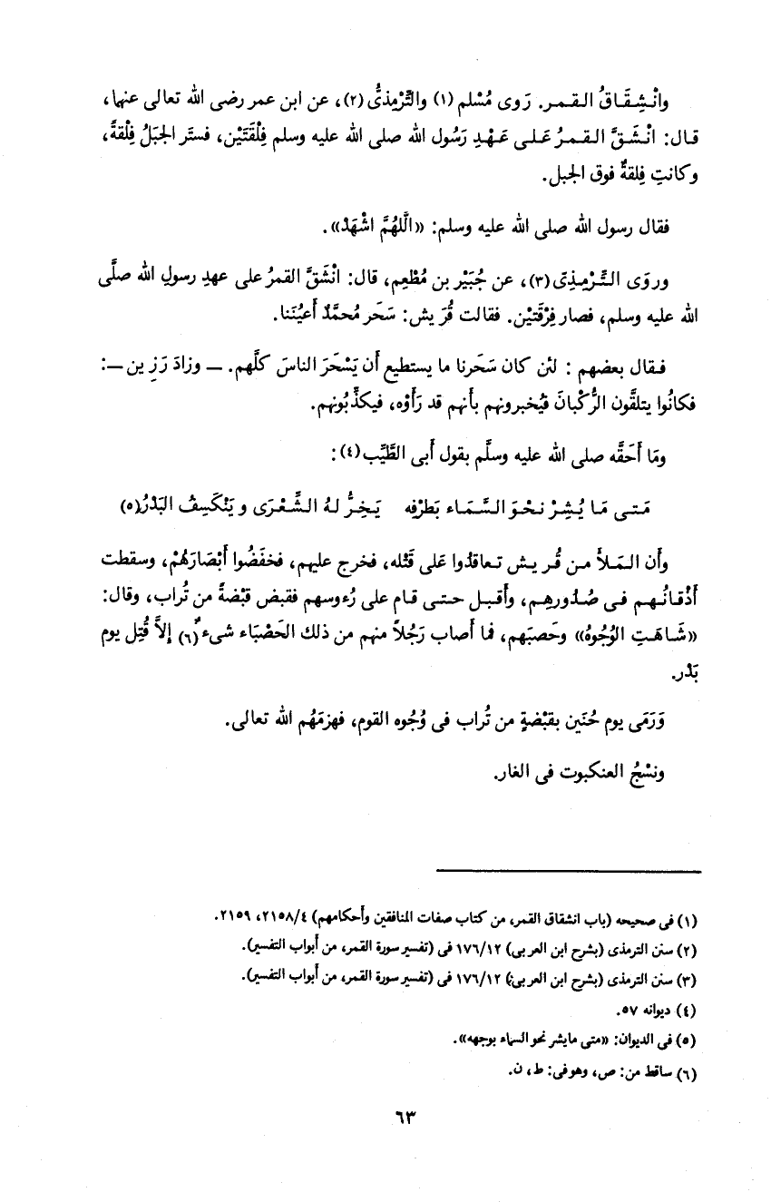 63 و انشقاق القمر. روى مسلم 1 و التّرمذىّ 2، عن ابن عمر رضى اللّه تعالى عنهما، قال: انشقّ القمر على عهد رسول اللّه صلى اللّه عليه و سلم فلقتين، فستر الجبل فلقة، و كانت فلقة فوق الجبل.