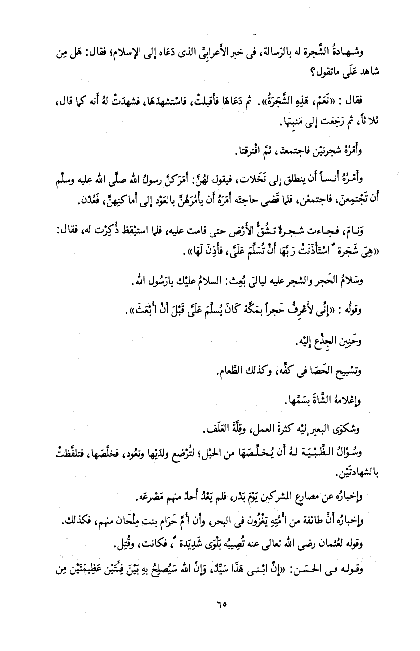 65 و شهادة الشّجرة له بالرّسالة، فى خبر الأعرابىّ الذى دعاه إلى الإسلام؛ فقال: هل من شاهد على ما تقول؟