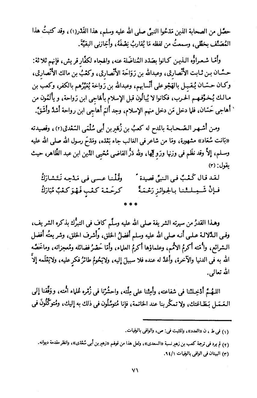 و من أشهر الصّحابة بالمدح له كعب بن زهير بن أبى سلمى السّعدىّ 2، و قصيدته «بانت سعاد» مشهورة، و ما من شاعر فى الغالب جاء بعده، و مدح رسول اللّه صلى اللّه عليه و سلم، إلاّ و قد نظم فى وزنها و رويّها، و للّه درّ القاضى محيى الدّين ابن عبد الظّاهر، حيث يقول: 3