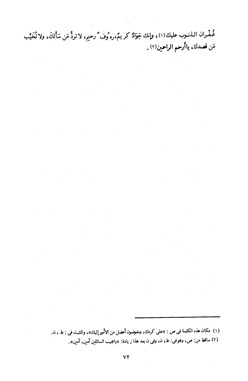 72 غفران الذنوب عليك 1، و إنك جواد كريم، رءوف رحيم، لا تردّ من سألك، و لا تخيّب من قصدك، يا أرحم الراحمين 2.