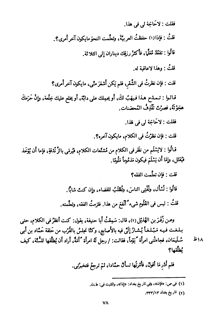 و عن زفر بن الهذيل 2، قال: سمعت أبا حنيفة، يقول: كنت أنظر فى الكلام، حتى بلغت فيه مبلغا يشار إلىّ فيه بالأصابع، و كنّا نجلس بالقرب من حلقة حمّاد بن أبى سليمان، فجاءتنى امرأة يوما، فقالت: /رجل له امرأة أمة، أراد أن يطلّقها للسّنّة، كيف يطلّقها؟