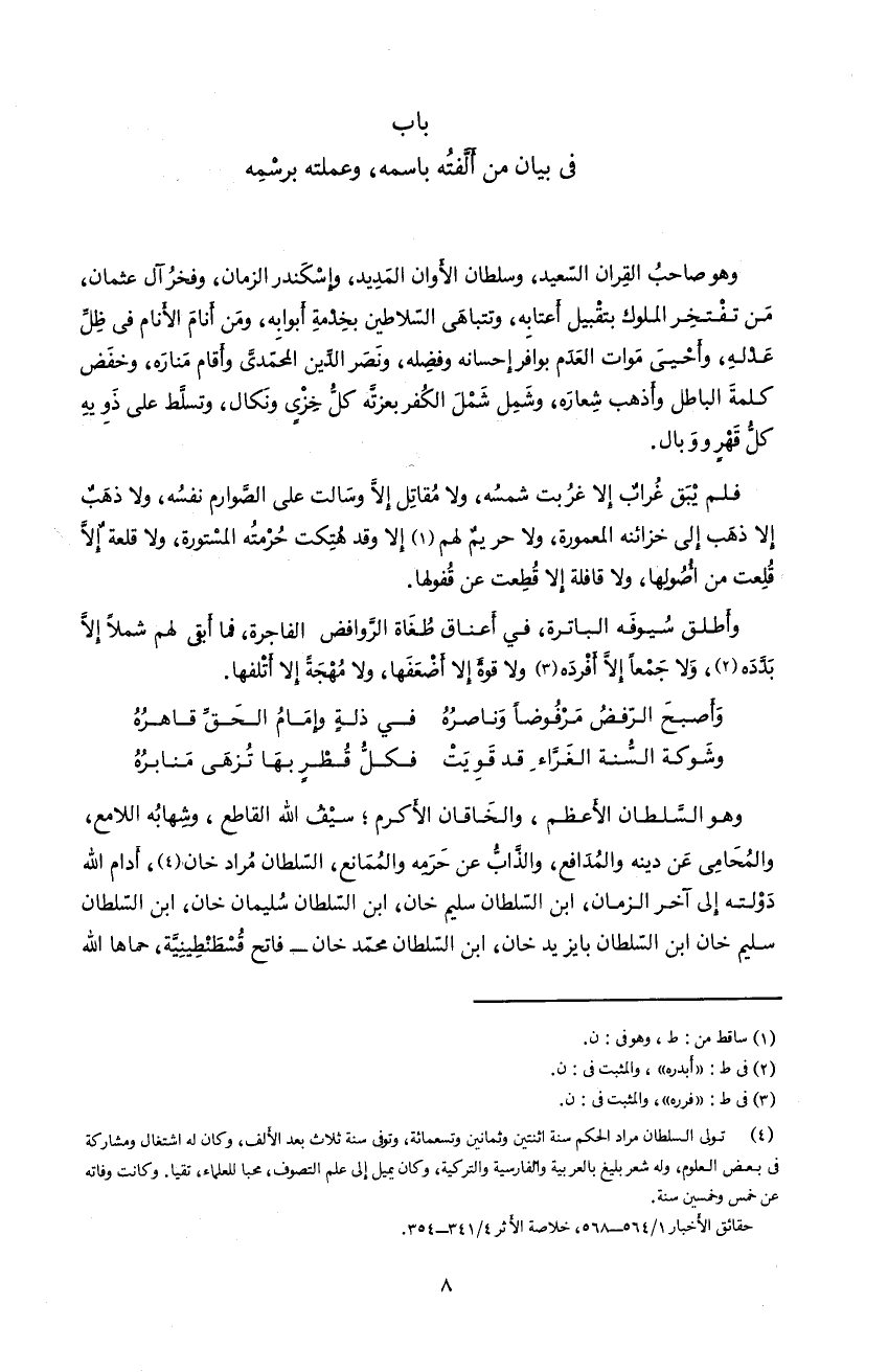 4) تولى السلطان مراد الحكم سنة اثنتين و ثمانين و تسعمائة، و توفى سنة ثلاث بعد الألف، و كان له اشتغال و مشاركة فى بعض العلوم، و له شعر بليغ بالعربية و الفارسية و التركية، و كان يميل إلى علم التصوف، محبا للعلماء، تقيا. و كانت وفاته عن خمس و خمسين سنة. حقائق الأخبار 1/ 564 - 568، خلاصة الأثر 4/ 341 - 354.