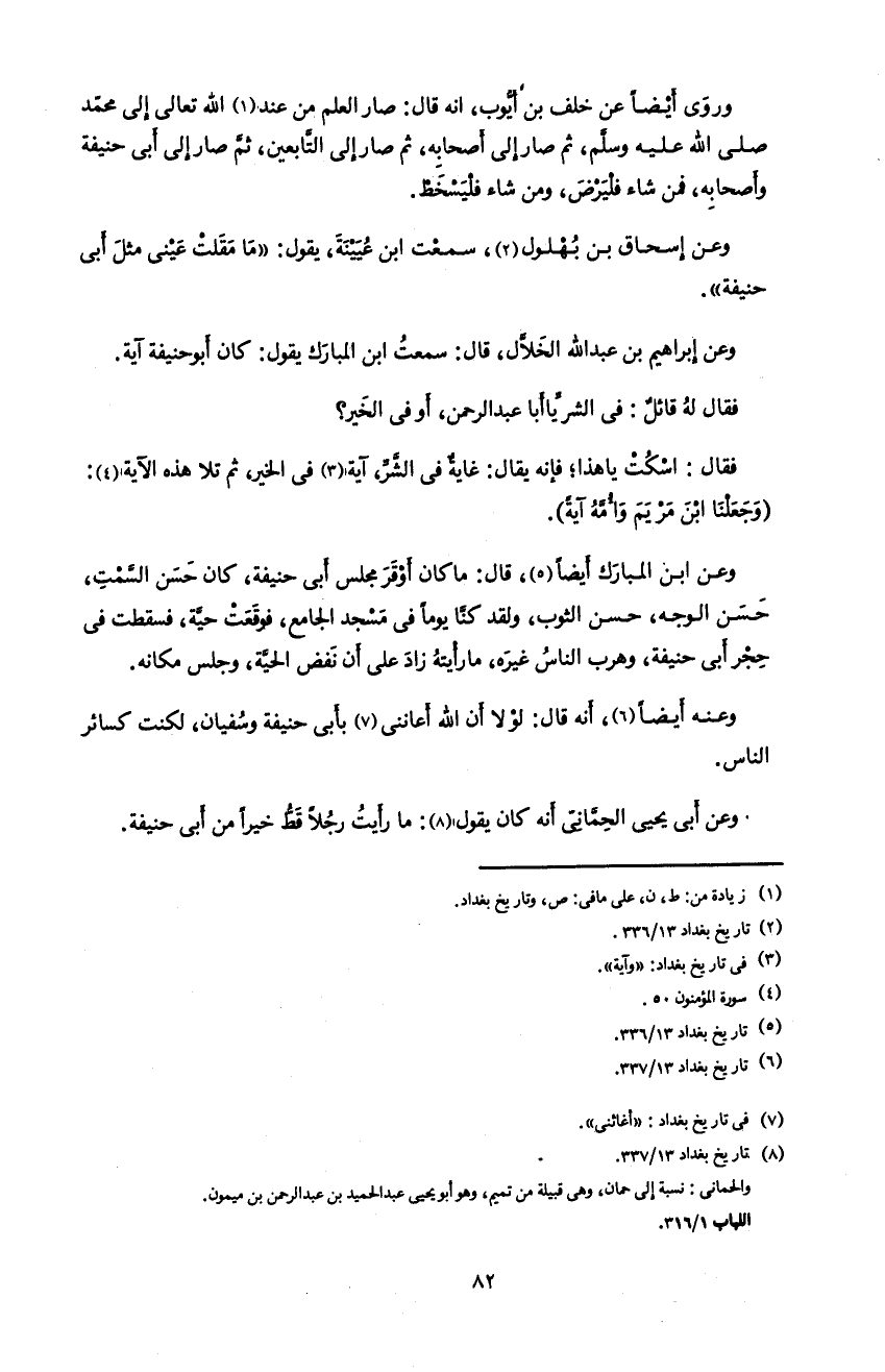 و عن إبراهيم بن عبد اللّه الخلاّل، قال: سمعت ابن المبارك يقول: كان أبو حنيفة آية.