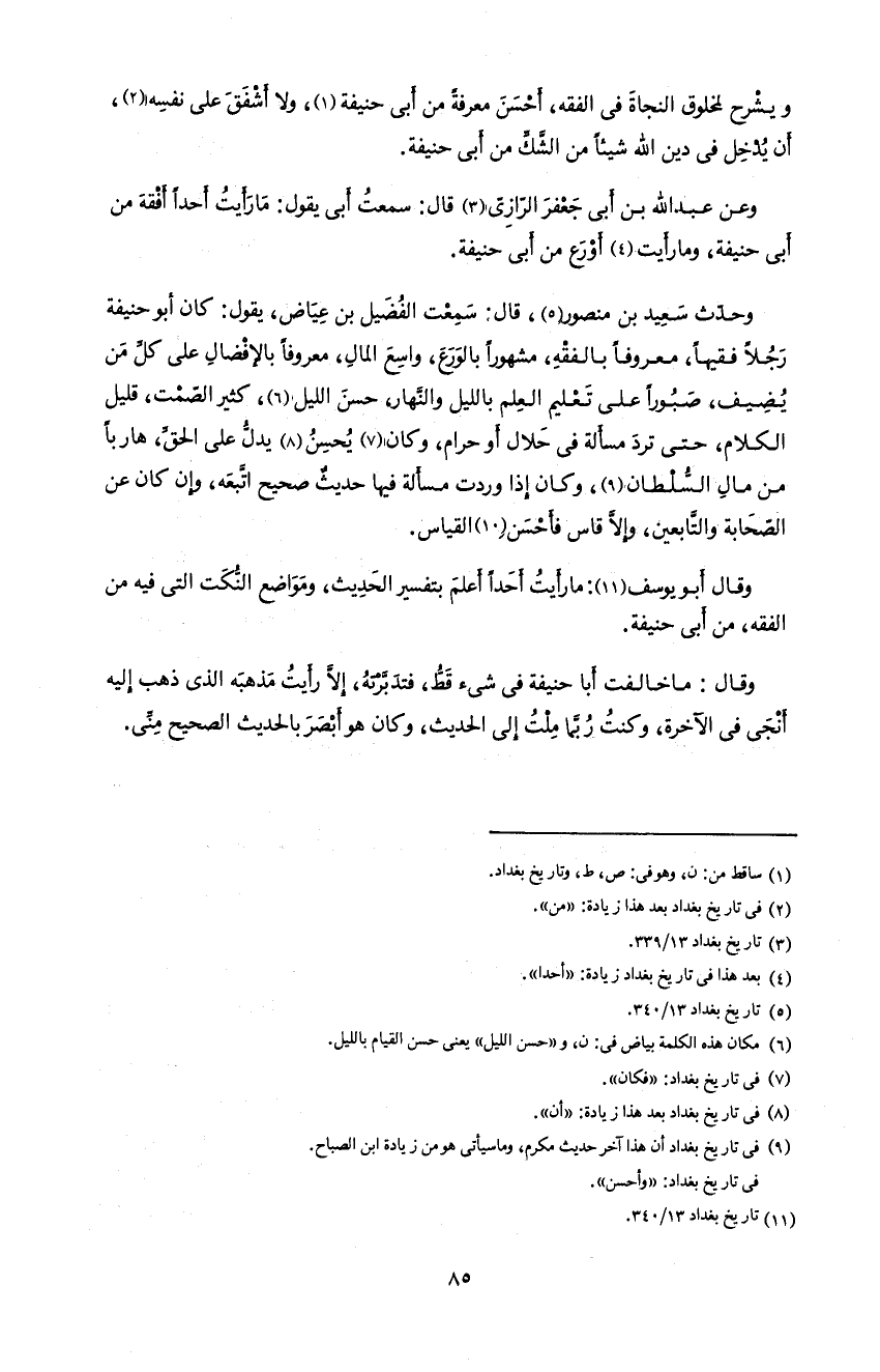 85 و يشرح لمخلوق النجاة فى الفقه، أحسن معرفة من أبى حنيفة 1، و لا أشفق على نفسه 2، أن يدخل فى دين اللّه شيئا من الشّكّ من أبى حنيفة.