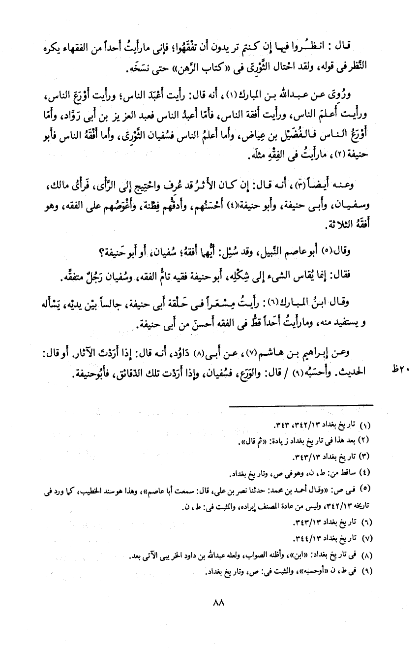 88 قال: انظروا فيها إن كنتم تريدون أن تفقهوا؛ فإنى ما رأيت أحدا من الفقهاء يكره النّظر فى قوله، و لقد احتال الثّورىّ فى «كتاب الرّهن» حتى نسخه.