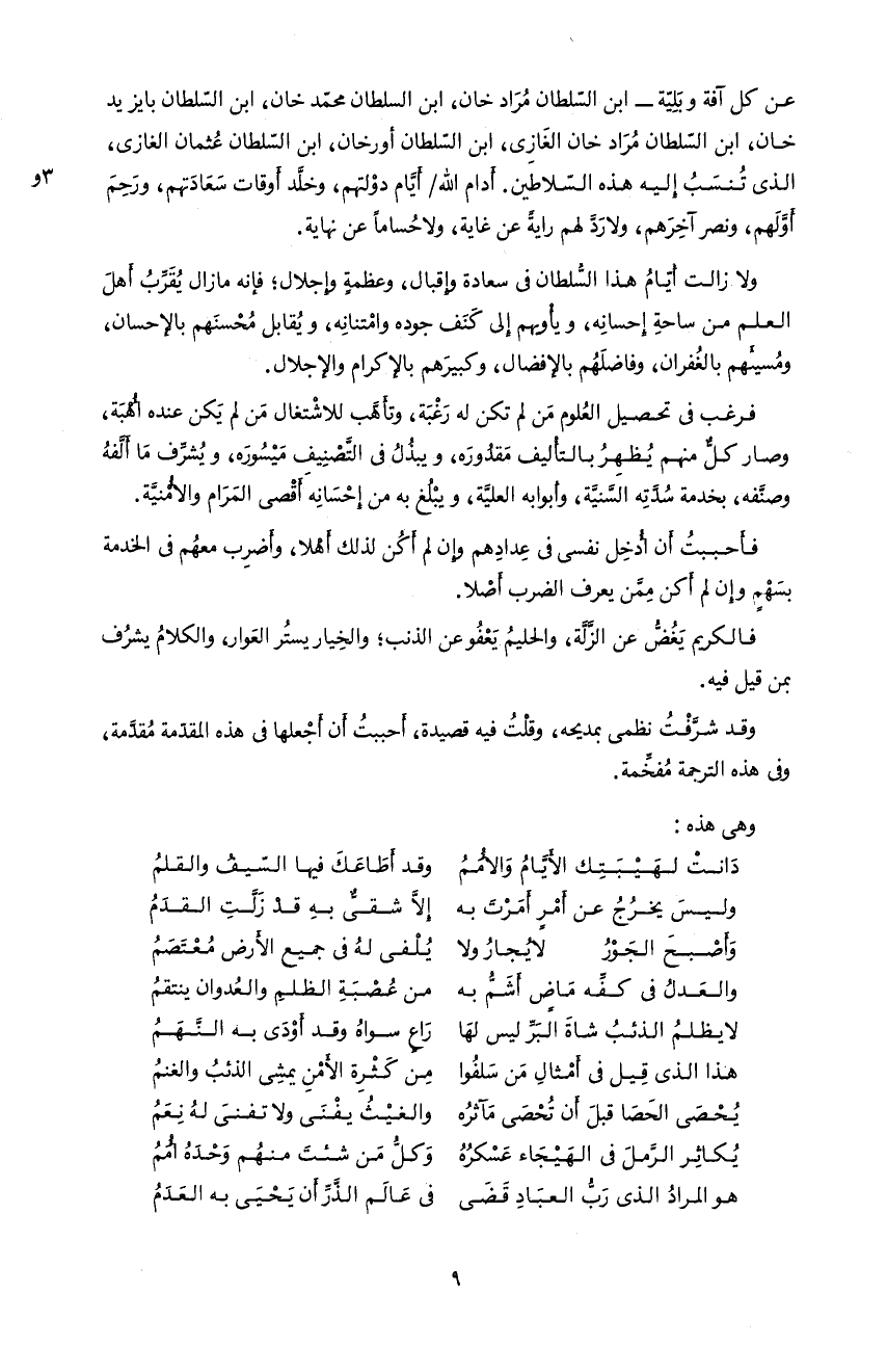 9 عن كل آفة و بليّة-ابن السّلطان مراد خان، ابن السلطان محمّد خان، ابن السّلطان بايزيد خان، ابن السّلطان مراد خان الغازى، ابن السّلطان أورخان، ابن السّلطان عثمان الغازى، الذى تنسب إليه هذه السّلاطين. أدام اللّه/أيّام دولتهم، و خلّد أوقات سعادتهم، و رحم أوّلهم، و نصر آخرهم، و لا ردّ لهم راية عن غاية، و لا حساما عن نهاية.