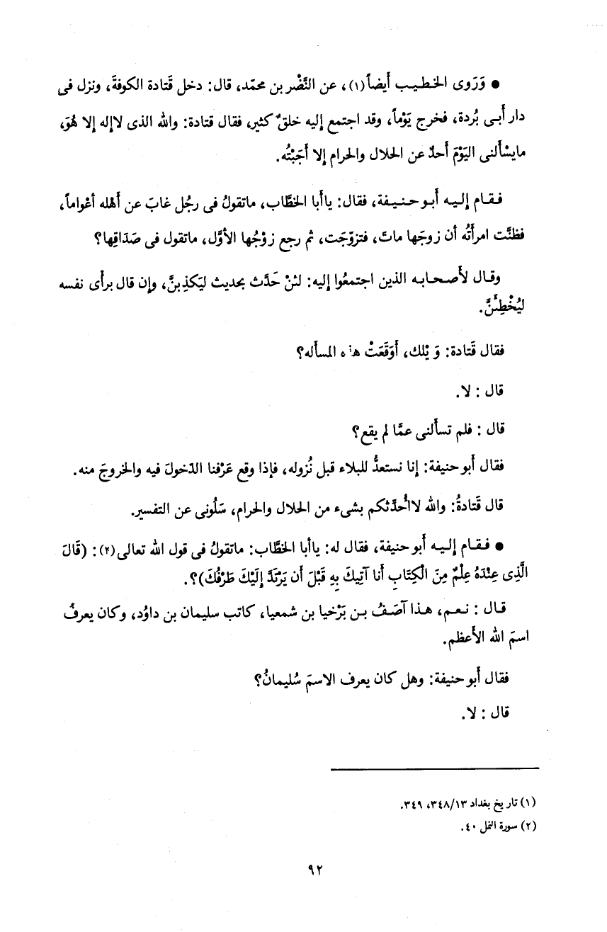 92 *و روى الخطيب أيضا 1، عن النّضر بن محمّد، قال: دخل قتادة الكوفة، و نزل فى دار أبى بردة، فخرج يوما، و قد اجتمع إليه خلق كثير، فقال قتادة: و اللّه الذى لا إله إلا هو، ما يسألنى اليوم أحد عن الحلال و الحرام إلا أجبته.