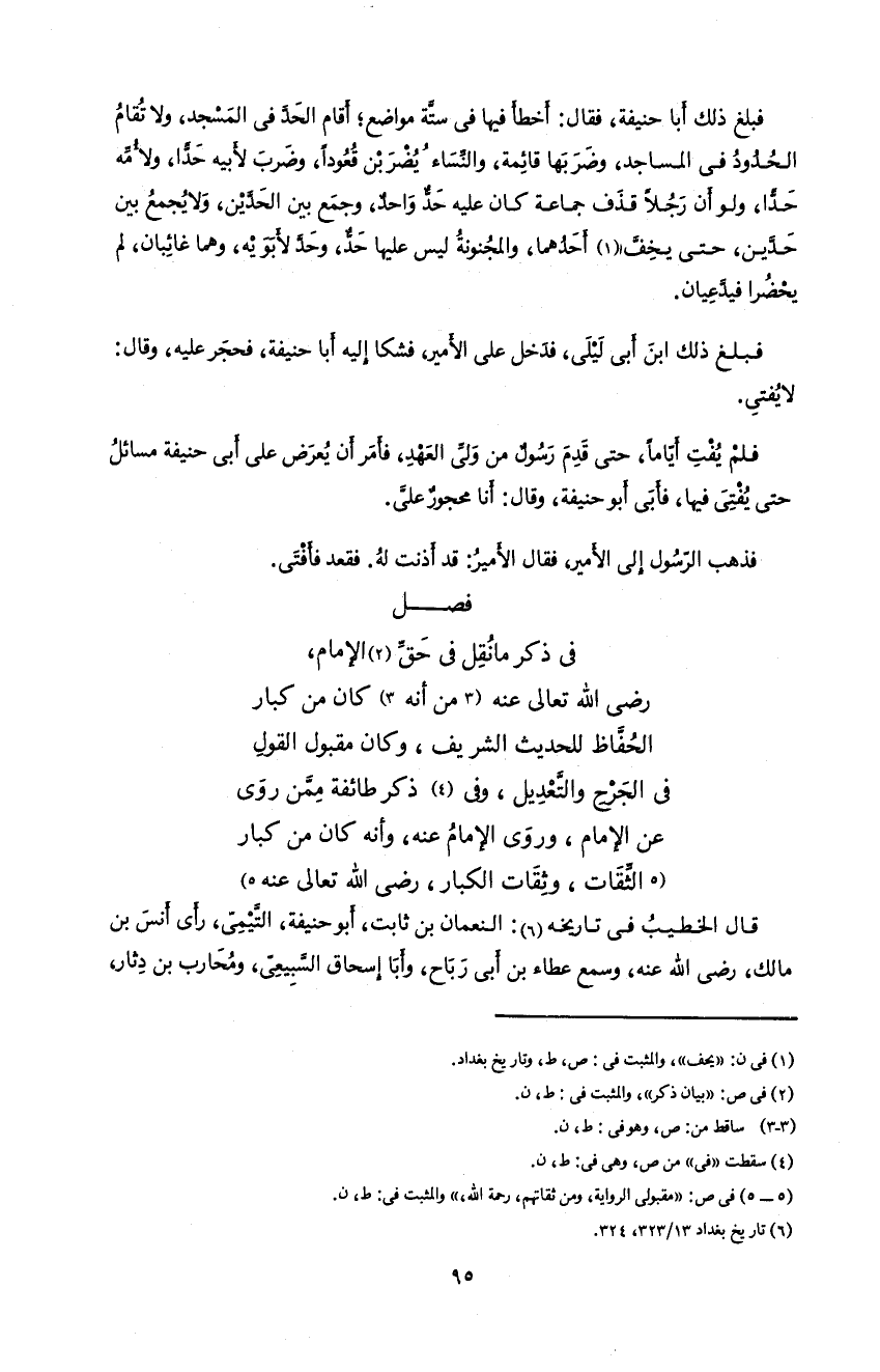 فصل فى ذكر ما نقل فى حقّ 2 الإمام، رضى اللّه تعالى عنه 3 من أنه 3 كان من كبار الحفّاظ للحديث الشريف، و كان مقبول القول فى الجرح و التّعديل، و فى 4 ذكر طائفة ممّن روى عن الإمام، و روى الإمام عنه، و أنه كان من كبار 5 الثّقات، و ثقات الكبار، رضى اللّه تعالى عنه 5