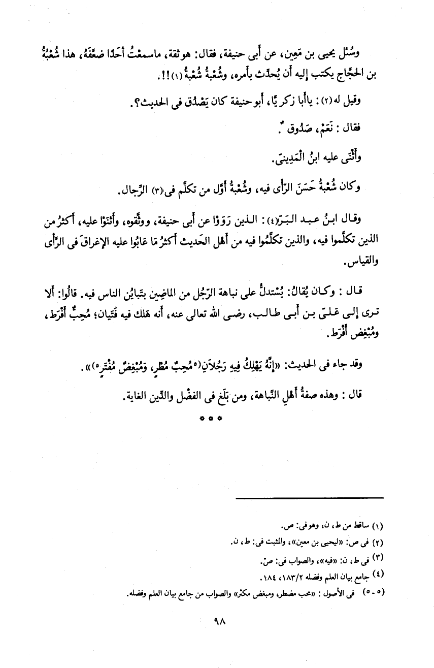 98 و سئل يحيى بن معين، عن أبى حنيفة، فقال: هو ثقة، ما سمعت أحدا ضعّفه، هذا شعبة بن الحجّاج يكتب إليه أن يحدّث بأمره، و شعبة شعبة 1!!.