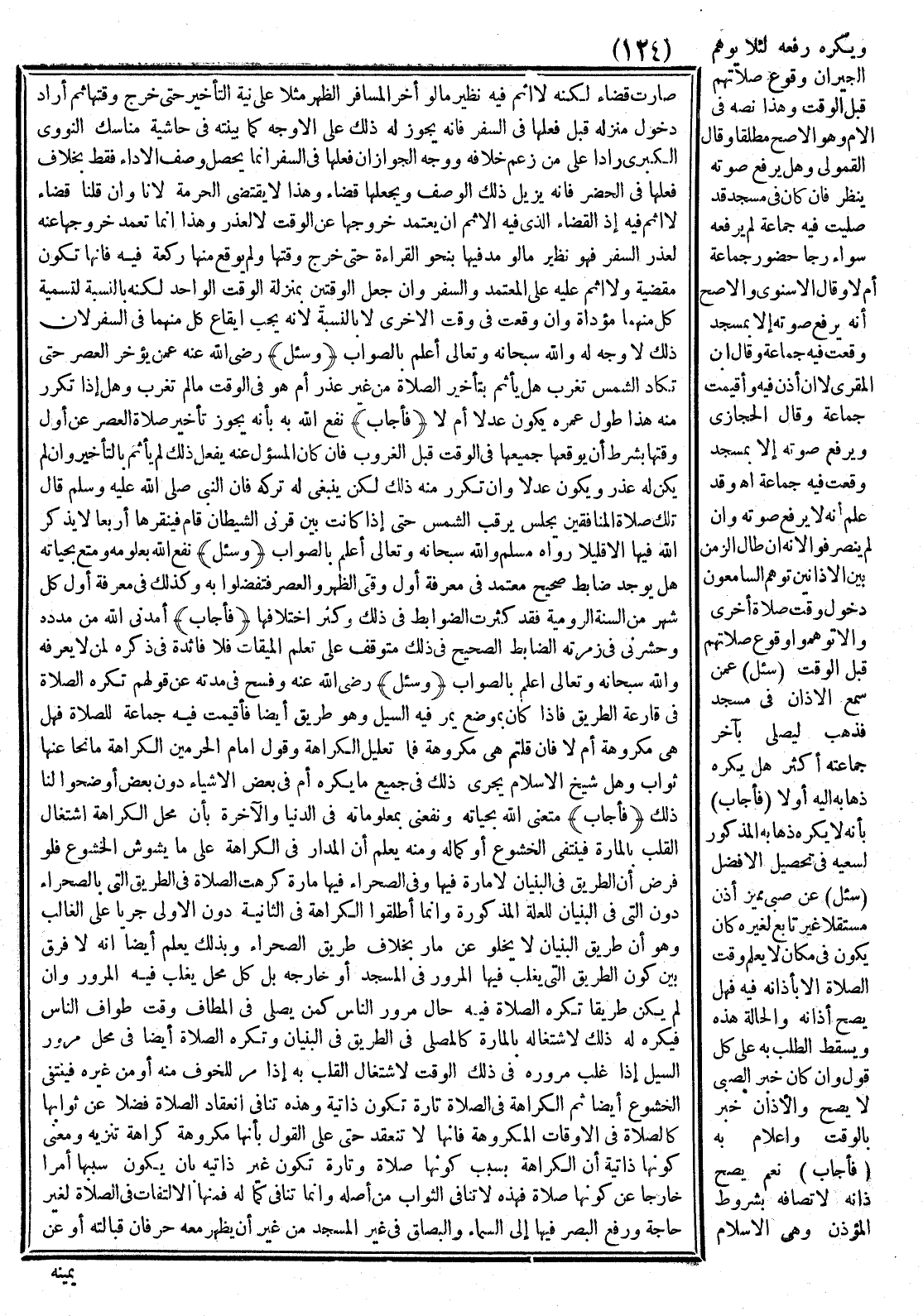 (وَسُئِلَ) - رَضِيَ اللَّهُ عَنْهُ - وَفَسَحَ فِي مُدَّتِهِ - عَنْ قَوْلِهِمْ: تُكْرَهُ الصَّلَاةُ فِي قَارِعَةِ الطَّرِيقِ فَإِذَا كَانَ بِمَوْضِعٍ يَمُرُّ فِيهِ السَّيْلُ، وَهُوَ طَرِيقٌ أَيْضًا؛ فَأُقِيمَتْ فِيهِ جَمَاعَةٌ لِلصَّلَاةِ فَهَلْ هِيَ مَكْرُوهَةٌ أَمْ لَا؟ فَإِنْ قُلْتُمْ: هِيَ مَكْرُوهَةٌ. فَمَا تَعْلِيلُ الْكَرَاهَةِ؛ وَقَوْلُ إمَامِ الْحَرَمَيْنِ: الْكَرَاهَةُ تُجَامِعُ الثَّوَابَ؟ وَهَلْ شَيْخُ الْإِسْلَامِ يُجْرِي ذَلِكَ فِي جَمِيعِ مَا يُكْرَهُ أَمْ فِي بَعْضِ الْأَشْيَاءِ دُونَ بَعْضٍ أَوْضِحُوا لَنَا ذَلِكَ