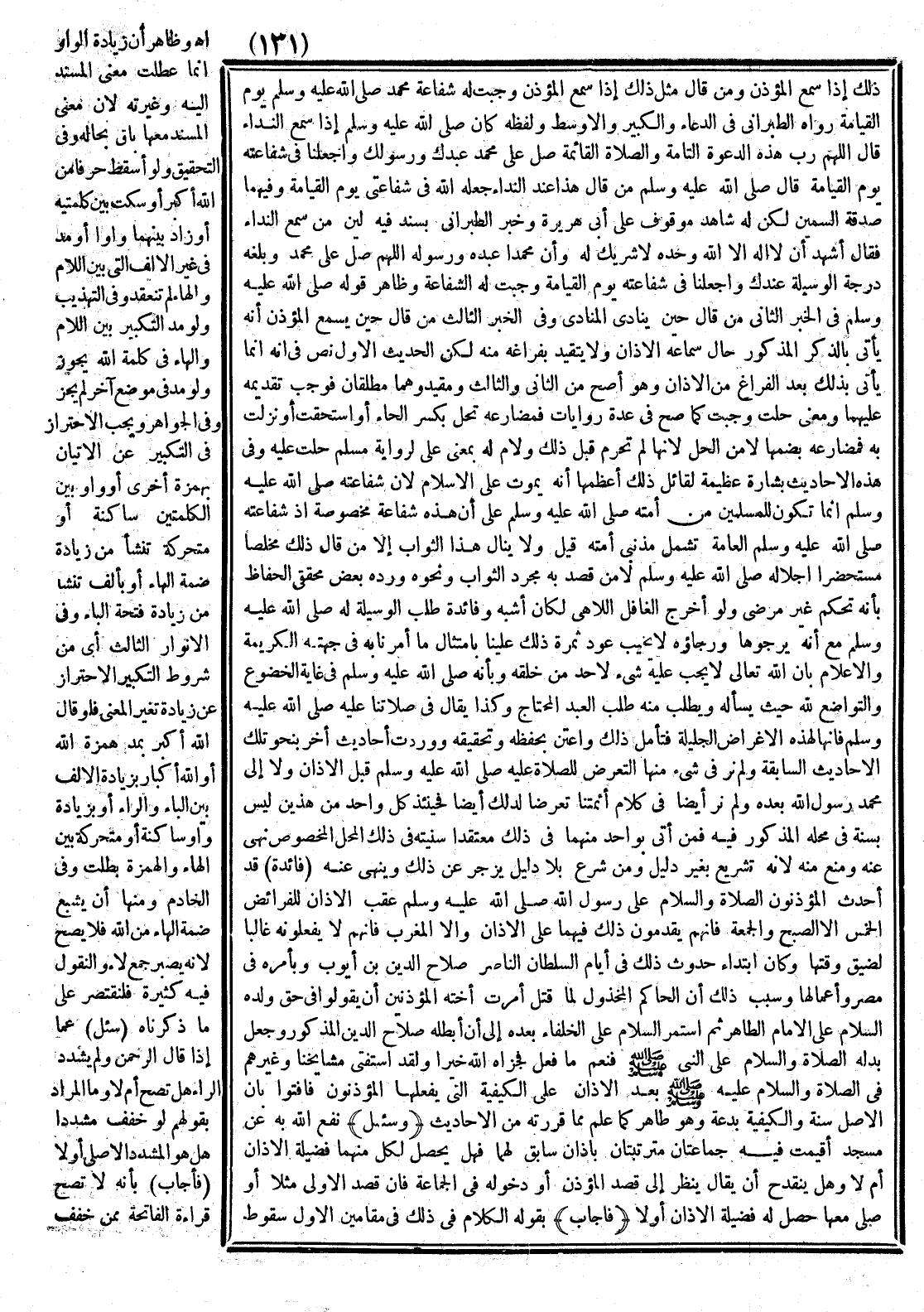 وَرَدَّهُ بَعْضُ مُحَقِّقِي الْحُفَّاظِ بِأَنَّهُ تَحَكُّمٌ غَيْرُ مَرْضِيٍّ وَلَوْ أَخْرَجَ الْغَافِلَ اللَّاهِي لَكَانَ أَشْبَهَ. وَفَائِدَةُ طَلَبِ الْوَسِيلَةِ لَهُ - صَلَّى اللَّهُ عَلَيْهِ وَسَلَّمَ - مَعَ أَنَّهُ يَرْجُوهَا، وَرَجَاؤُهُ لَا يَخِيبُ - عَوْدُ ثَمَرَةِ ذَلِكَ عَلَيْنَا؛ بِامْتِثَالِ مَا أُمِرْنَا بِهِ فِي جِهَتِهِ الْكَرِيمَةِ، وَالْإِعْلَامُ بِأَنَّ اللَّهَ تَعَالَى لَا يَجِبُ عَلَيْهِ شَيْءٌ لِأَحَدٍ مِنْ خَلْقِهِ، وَبِأَنَّهُ - صَلَّى اللَّهُ عَلَيْهِ وَسَلَّمَ - فِي غَايَةِ الْخُضُوعِ وَالتَّوَاضُعِ لِلَّهِ؛ حَيْثُ يَسْأَلُهُ وَيَطْلُبُ مِنْهُ طَلَبَ الْعَبْدِ الْمُحْتَاجِ. وَكَذَا يُقَالُ فِي صَلَاتِنَا عَلَيْهِ - صَلَّى اللَّهُ عَلَيْهِ وَسَلَّمَ -؛ فَإِنَّهَا لِهَذِهِ الْأَغْرَاضِ الْجَلِيلَةِ؛ فَتَأَمَّلْ ذَلِكَ، وَاعْتَنِ بِحِفْظِهِ وَتَحْقِيقِهِ. وَوَرَدَتْ أَحَادِيثُ أُخَرُ بِنَحْوِ تِلْكَ الْأَحَادِيثِ السَّابِقَةِ، وَلَمْ نَرَ فِي شَيْءٍ مِنْهَا التَّعَرُّضَ لِلصَّلَاةِ عَلَيْهِ قَبْلَ الْأَذَانِ، وَلَا إلَى مُحَمَّدٍ رَسُولِ اللَّهِ بَعْدَهُ وَلَمْ نَرَ أَيْضًا فِي كَلَامِ أَئِمَّتِنَا تَعَرُّضًا لِذَلِكَ أَيْضًا، فَحِينَئِذٍ كُلُّ وَاحِدٍ مِنْ هَذَيْنِ لَيْسَ بِسُنَّةٍ فِي مَحَلِّهِ الْمَذْكُورِ فِيهِ، فَمَنْ أَتَى بِوَاحِدٍ مِنْهُمَا فِي ذَلِكَ مُعْتَقِدًا سُنِّيَّتَهُ فِي ذَلِكَ الْمَحَلِّ الْمَخْصُوصِ نُهِيَ عَنْهُ وَمُنِعَ مِنْهُ؛ لِأَنَّهُ تَشْرِيعٌ بِغَيْرِ دَلِيلٍ؛ وَمَنْ شَرَّعَ بِلَا دَلِيلٍ يُزْجَرُ عَنْ ذَلِكَ وَيُنْهَى عَنْهُ.