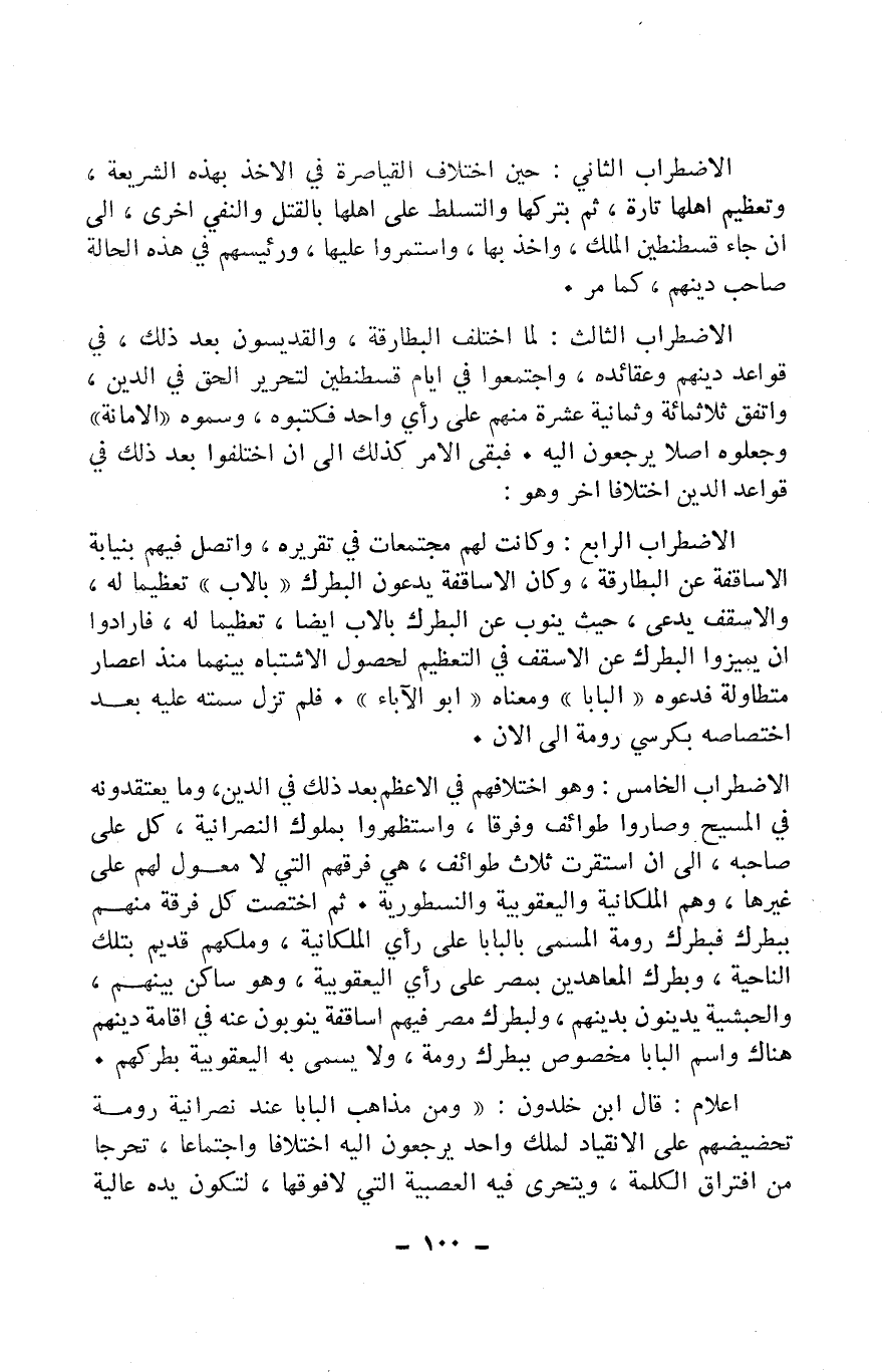 الِاضْطِرَاب الْخَامِس وَهُوَ اخْتلَافهمْ فِي الْأَعْظَم بعد ذَلِك فِي الدّين وَمَا يعتقدونه فِي الْمَسِيح وصاروا طوائف وفرقا واستظهروا بملوك النَّصْرَانِيَّة كل على صَاحبه غلى أَن اسْتَقَرَّتْ ثَلَاث طوائف هِيَ فرقهم الَّتِي لَا معول لَهُم على غَيرهَا وهم الملكانية واليعقوبية والنسطورية ثمَّ اخْتصّت كل فرقة مِنْهُم ببطرك فبطرك رومة الْمُسَمّى بالبابا على رَأْي الملكانية وملكهم قديم بِتِلْكَ النَّاحِيَة وبطرك المعاهدين بِمصْر على رَأْي اليعقوبية وَهُوَ سَاكن بَينهم والحبشية يدينون بدينهم ولبطرك مصر فيهم أساقفة ينوبون عَنهُ فِي إِقَامَة دينهم هُنَاكَ وإسم البابا مَخْصُوص ببطرك رومة وَلَا يُسمى بِهِ اليعقوبية بطركم