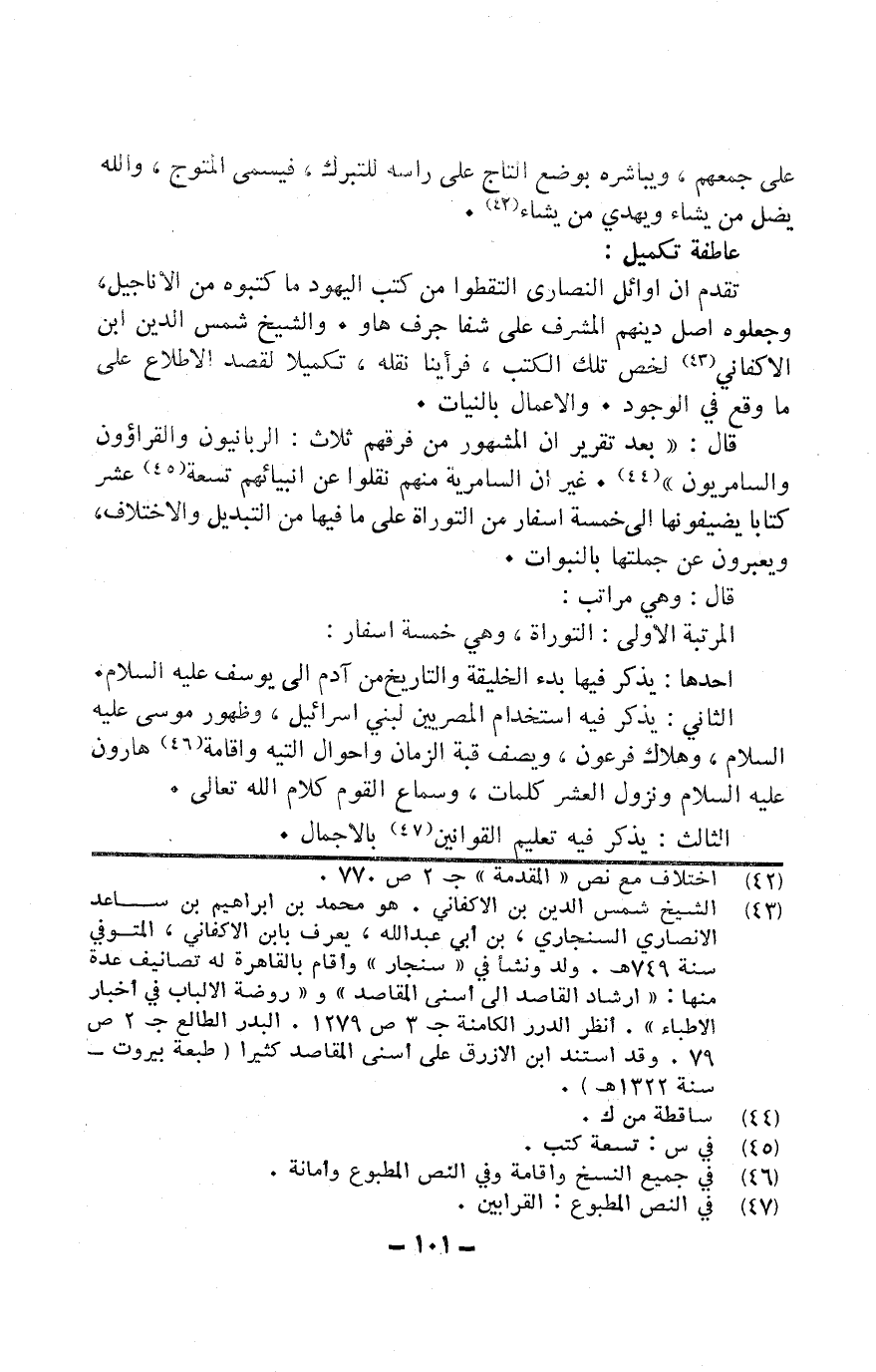 تقدم أَن أَوَائِل النَّصَارَى التقطوا من كتب الْيَهُود مَا كتبوه من الأناجيل وجعلوه اصل دينهم المشرف على شفا جرف هاو وَالشَّيْخ شمس الدّين ابْن الْأَكْفَانِيِّ لخص تِلْكَ الْكتب فَرَأَيْنَا نَقله تكميلا لقصد الإطلاع على مَا وَقع فِي الْوُجُود والأعمال بِالنِّيَّاتِ
