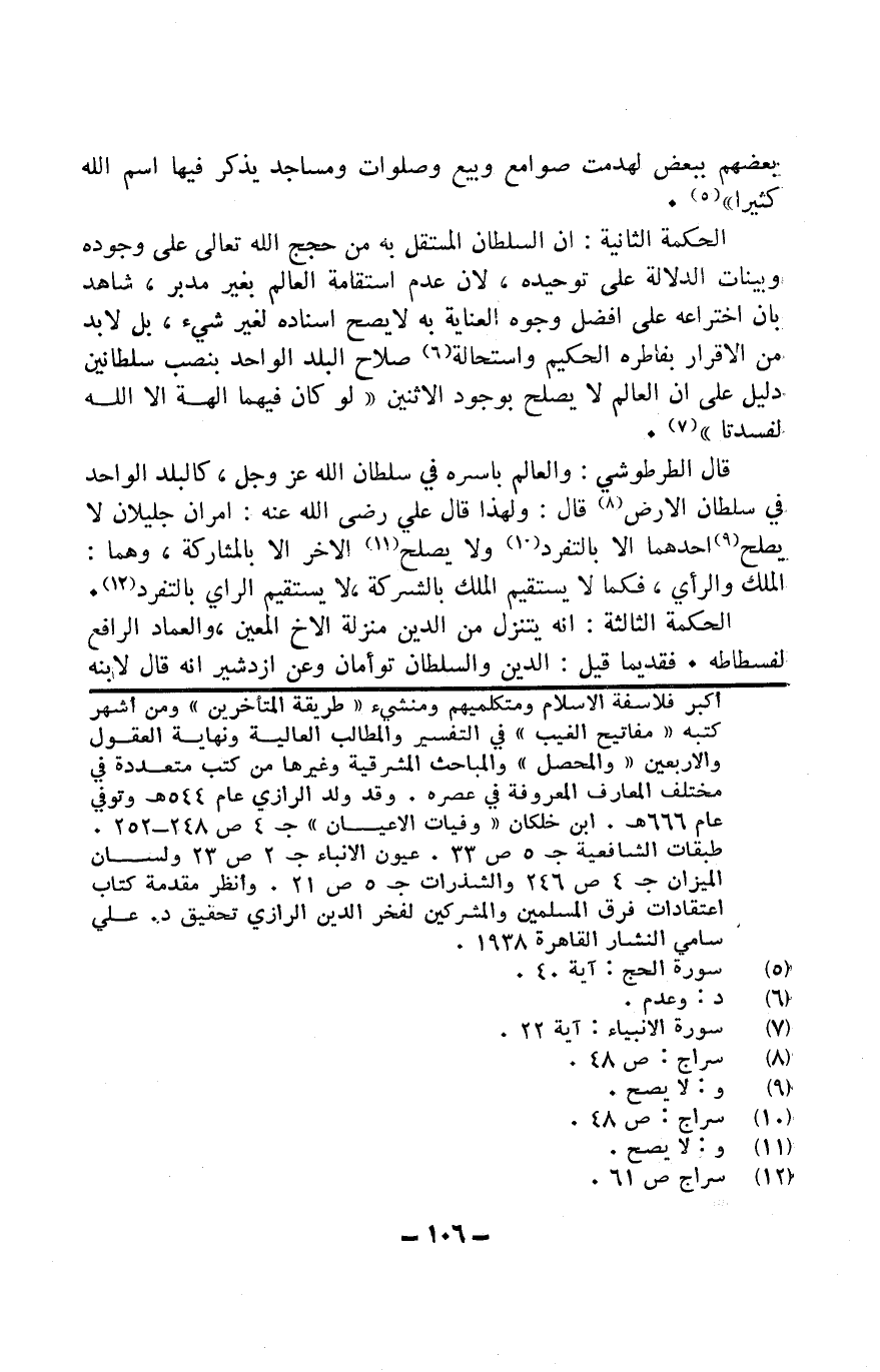 الْحِكْمَة الثَّانِيَة أَن السُّلْطَان المستقل بِهِ من حجج الله تَعَالَى وعَلى وجوده وبينات الدّلَالَة على توحيده لِأَن عدم استقامة الْعَالم بِغَيْر مُدبر شَاهد بِأَن اختراعه على أفضل وُجُوه الْعِنَايَة بِهِ لَا يَصح إِسْنَاده لغير شَيْء بل لابد من الْإِقْرَار بفاطره الْحَكِيم واستحالة صَلَاح الْبَلَد الْوَاحِد بِنصب سلطانين دَلِيل على أَن الْعَالم لَا يصلح بِوُجُود الِاثْنَيْنِ {لَو كَانَ فيهمَا آلِهَة إِلَّا الله لفسدتا}