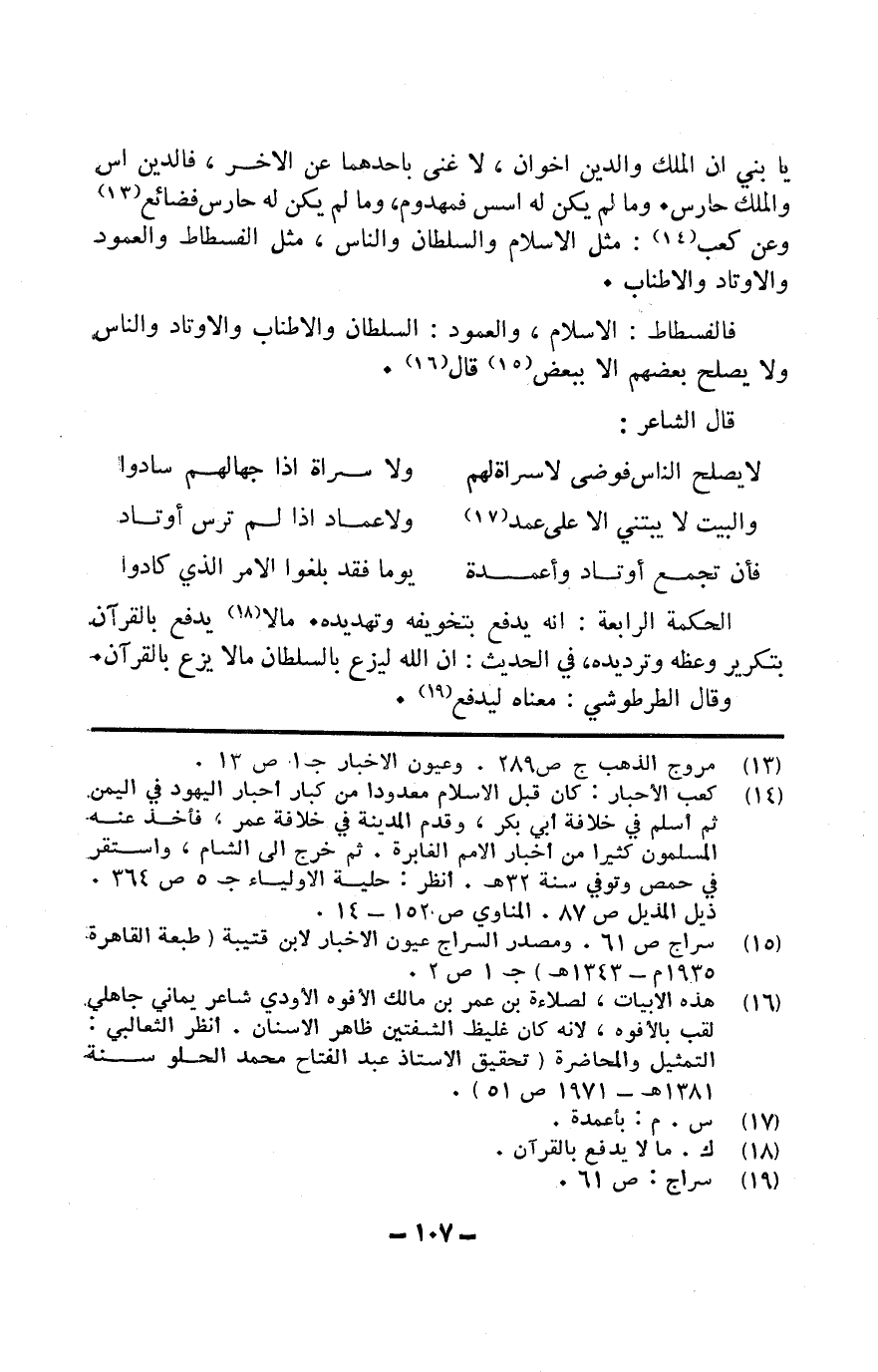 يَا بني إِن الْملك وَالدّين أَخَوان لَا غنى لأَحَدهمَا عَن الآخر فالدين أس وَالْملك حارس وَمَا لم يكن لَهُ أسس فمهدوم وَمَا لم يكن لَهُ حارس فضائع وَعَن كَعْب مثل الْإِسْلَام وَالسُّلْطَان وَالنَّاس مثل الْفسْطَاط والعمود والأوتاد والأطناب