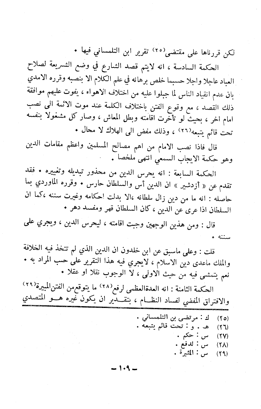 الْحِكْمَة السَّادِسَة إِنَّه لَا يتم قصد الشَّارِع فِي وَضعه الشَّرِيعَة لصلاح الْعباد عَاجلا وآجلا حَسْبَمَا خلص برهانه فِي علم الْكَلَام إِلَّا بنصبه وَقَررهُ الأمدي بِأَن عدم انقياد النَّاس لما جبلوا عَلَيْهِ من اخْتِلَاف الْأَهْوَاء يفوت عَلَيْهِم مُوَافقَة ذَلِك الْقَصْد مَعَ وُقُوع الْفِتَن باخْتلَاف الْكَلِمَة عِنْد موت الْأَئِمَّة إِلَى نصب إِمَام آخر بِحَيْثُ لَو تَأَخَّرت إِقَامَته وَبَطل المعاش وَصَارَ كل مَشْغُول بِنَفسِهِ تَحت قَائِم يتبعهُ وَذَلِكَ مفض إِلَى الْهَلَاك لَا محَال