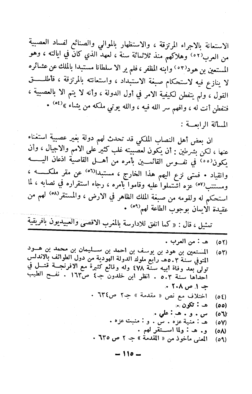 الِاسْتِعَانَة بالإجراء المرتزقة والاستظهار بِالْمَوَالِي والصنائع لفساد العصبية من الْعَرَب وهلاكهم مُنْذُ ثَلَاثمِائَة سنة لعهد الَّذِي كَانَ فِي ايالته وَهُوَ المستعين بن هود وَابْنه المظفر فَلم ير إِلَّا سُلْطَانا مستبدا بِالْملكِ عَن عشائره لَا يُنَازع فِيهِ لاستحكام صبغة الاستبداد واستعانته بالمرتزقة فَأطلق القَوْل وَلم يتفطن لكيفية الْأَمر فِي أول الدولة وَأَنه لَا يتم إِلَّا بالعصبية فتظن أَنْت لَهُ وافهم سر الله فِيهِ وَالله يوتي ملكه من يَشَاء