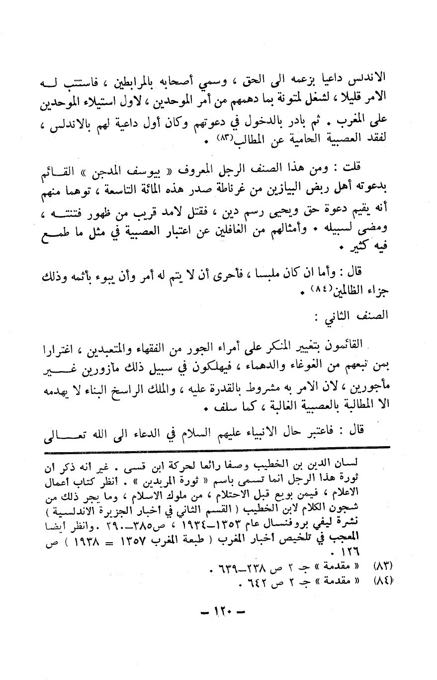 قلت وَمن هَذَا الصِّنْف الرجل الْمَعْرُوف بِيُوسُف المدجن الْقَائِم بدعوته أهل ربض البيازين صدر هَذِه الْمِائَة التَّاسِعَة توهما مِنْهُم أَنه يُقيم دَعْوَة حق ويحي رسم الدّين فَقتل لأمد قريب من ظُهُور فتْنَة وَمضى لسبيله وأمثالهم من الغافلين عَن اعْتِبَار العصبية فِي مثل مَا طمع فِيهِ كثير