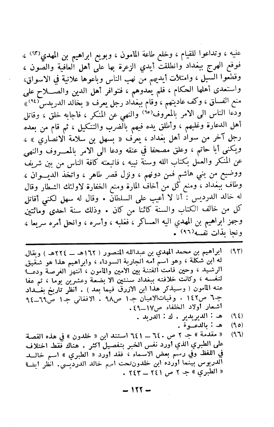 عَلَيْهِ وتداعوا للْقِيَام وخلع طَاعَة الْمَأْمُون وبويع إِبْرَاهِيم بن الْمهْدي فَوَقع الْهَرج بِبَغْدَاد وَانْطَلَقت أَيدي الزعرة بهَا على أهل الْعَافِيَة والصون وَقَطعُوا السبل وامتلأت أَيْديهم من نهب النَّاس وباعوها عَلَانيَة فِي الْأَسْوَاق واستعدى أَهلهَا الْحُكَّام فَلم يعدوهم فتوافر أهل الدّين وَالصَّلَاح على منع الْفُسَّاق وكف عاديتهم وَقَامَ بِبَغْدَاد رجل يعرف بِخَالِد الدريدس ودعا النَّاس إِلَى الْأَمر بِالْمَعْرُوفِ وَالنَّهْي عَن الْمُنكر فَأَجَابَهُ خلق وَقَاتل أهل الدعارة وغلبهم وَأطلق يَده فيهم بِالضَّرْبِ والتنكيل ثمَّ قَامَ من بعده رجل آخر من سَواد أهل بَغْدَاد يعرف بسهل بن سَلامَة الْأنْصَارِيّ ويكنى أَبَا حَاتِم وعلق مُصحفا فِي عُنُقه ودعا إِلَى الْأَمر بِالْمَعْرُوفِ وَالنَّهْي عَن الْمُنكر وَالْعَمَل بِكِتَاب الله وَسنة نبيه فاتبعته كَافَّة النَّاس من بَين شرِيف ووضيع من بني هَاشم فَمن دونهم وَنزل قصر طَاهِر وَاتخذ الدِّيوَان وَطَاف بِبَغْدَاد وَمنع كل من أَخَاف الْمَارَّة وَمنع الخفارة لأولئك الشطار وَقَالَ لَهُ خَالِد الدريدس أَنا لَا أعيب على السُّلْطَان وَقَالَ لَهُ سهل لكني أقَاتل كل من خَالف الْكتاب وَالسّنة كَائِنا من كَانَ وَذَلِكَ سنة إِحْدَى وَمِائَتَيْنِ وجهز إِبْرَاهِيم بن الْمهْدي إِلَيْهِ العساكر فغلبه وأسره وانحل أمره سَرِيعا وَنَجَا بِذَات نَفسه